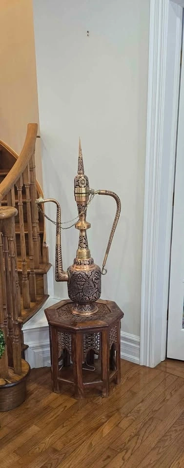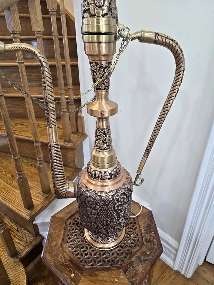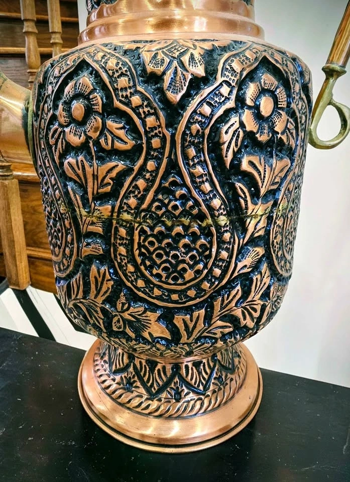 Make a bold statement with this breathtaking, 39-inch tall artisan-crafted floor ewer. Standing nearly 3.5 feet high, this is a rare, grand-scale architectural piece that brings an "Old World" luxury feel to any space. It features intricate, hand-wrought engravings and deep-etched floral motifs across the entire copper body, accented by polished brass rings. At 39" tall, it is perfectly sized to stand on the floor as a focal point in an entryway, a lounge, or beside a fireplace. The rich, dark patina in the recessed etchings provides a beautiful contrast against the warm copper and brass tones, fitting perfectly into Boho, Maximalist, or Global-inspired interiors. Beautiful vintage condition with a sturdy weight and original chain-linked lid.