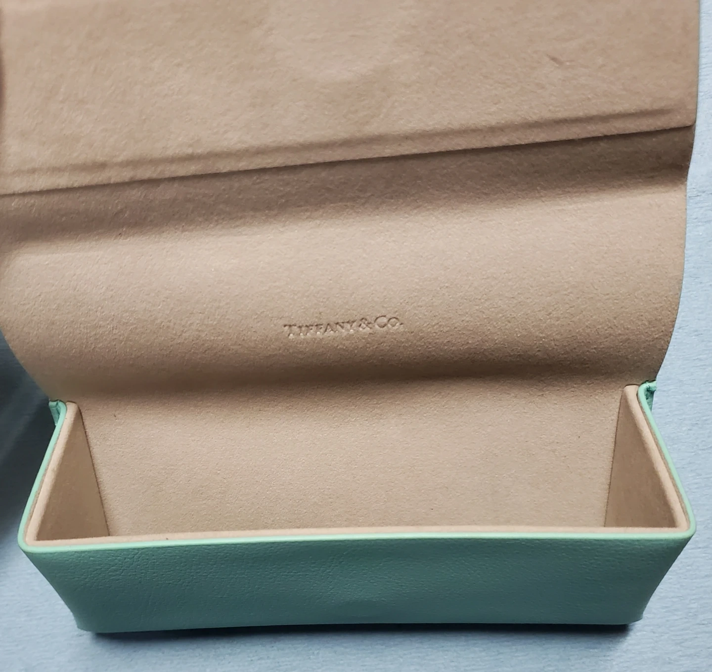 This Tiffany & Co. eyeglass case comes in a lovely mint green colour. It includes a soft cleaning cloth, also branded. The interior is a neutral beige. It's designed to protect your glasses!