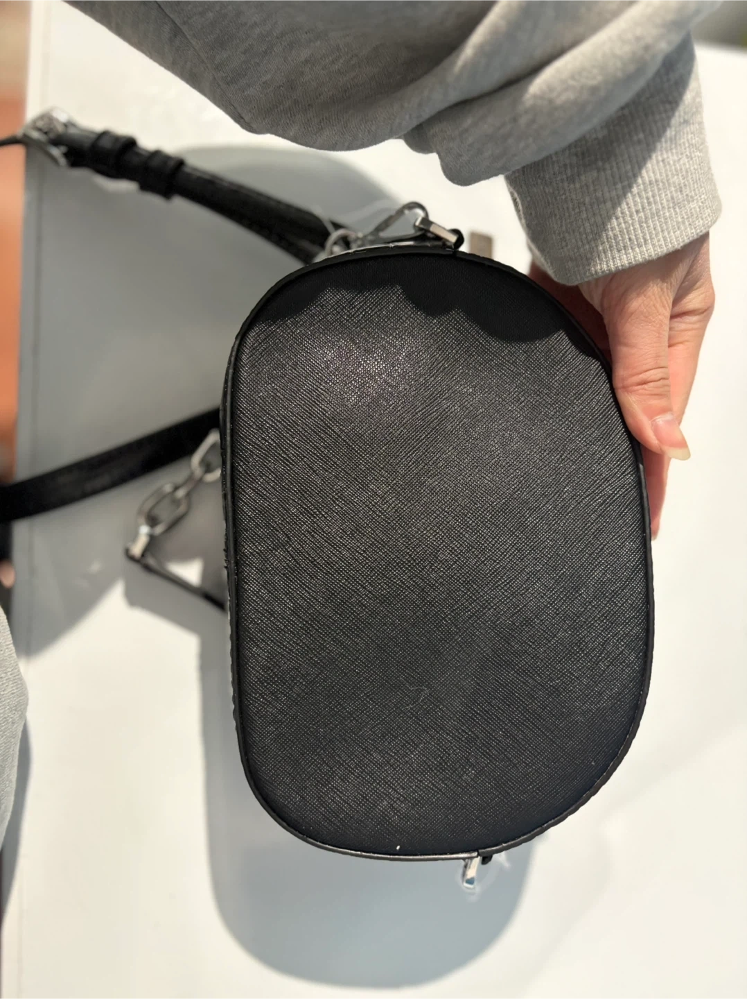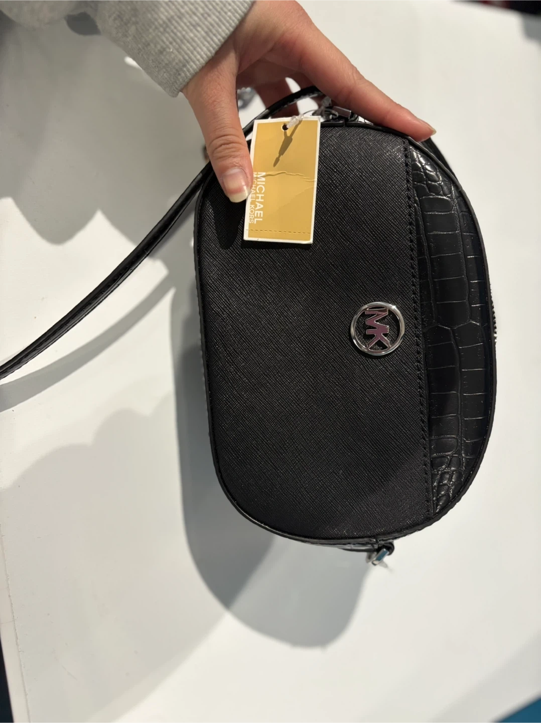 This is a Michael Kors crossbody bag in black. It's made of leather with a crocodile-embossed detail. It features a chain strap and zip closure.