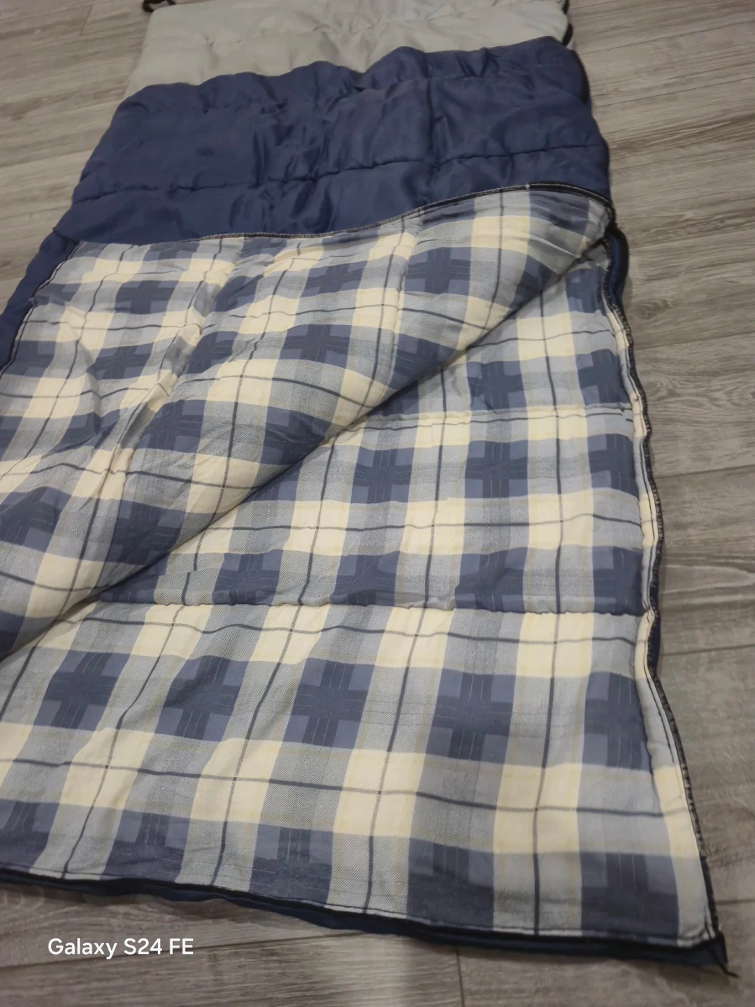 Selling a blue sleeping bag with a plaid interior. It's in good condition and ready for your next camping trip! Perfect for staying warm on those cool nights