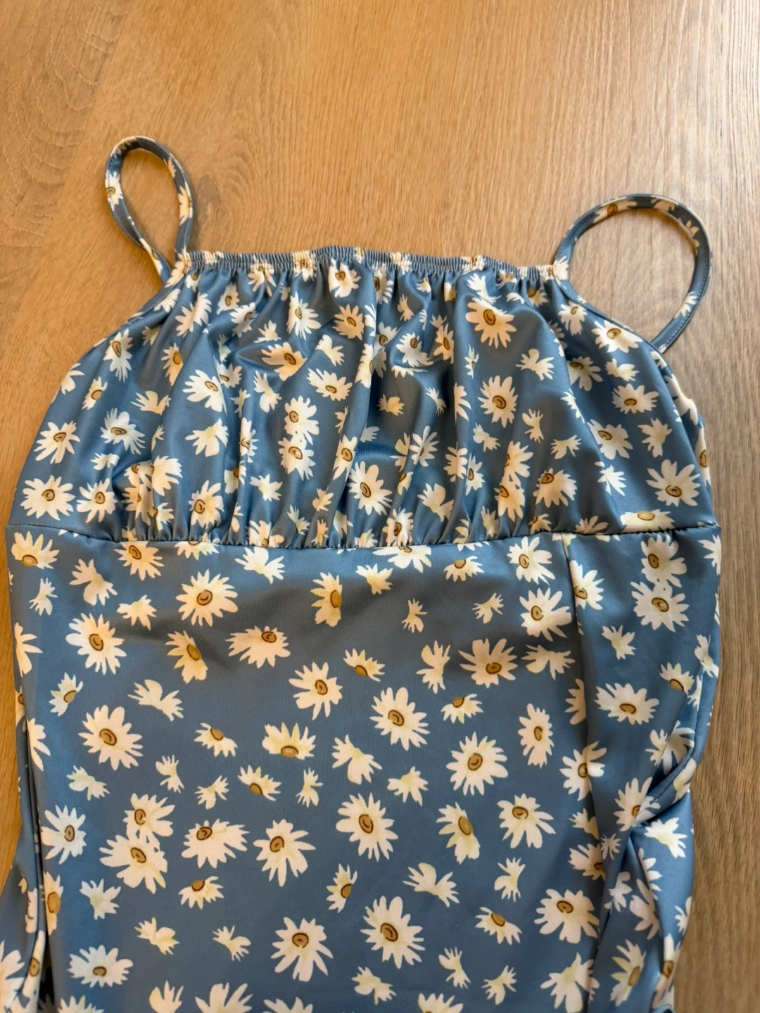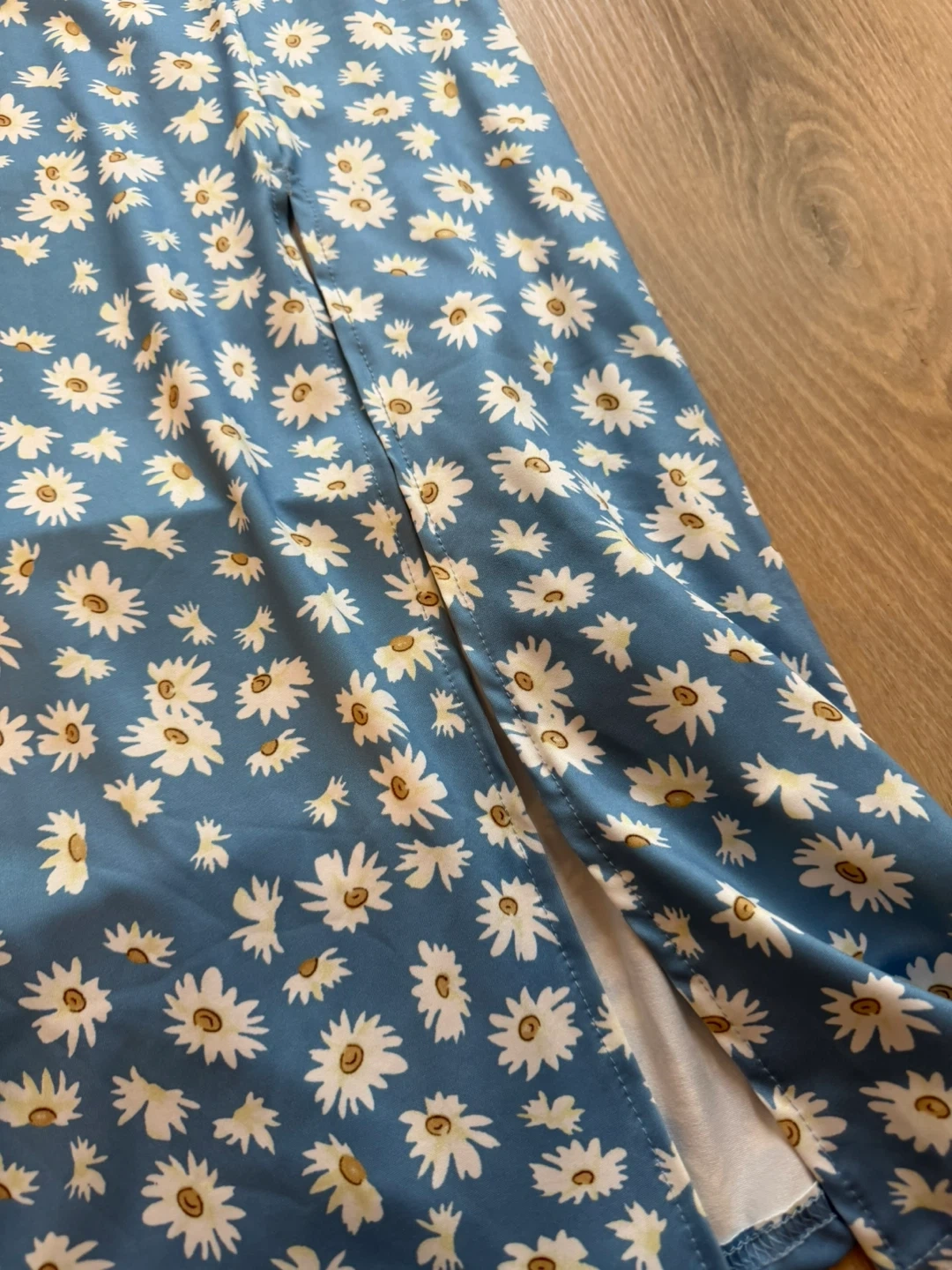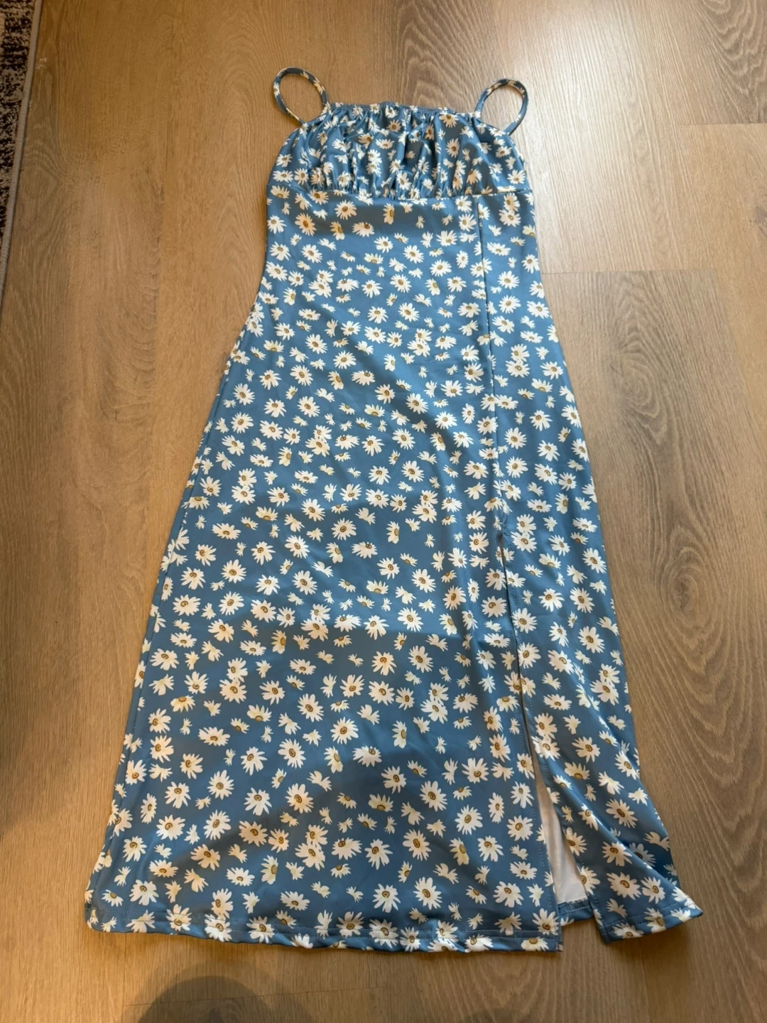 Cute daisy print dress in a lovely shade of blue! It's perfect for summer days or a casual outing. The dress features a slit detail and thin straps, making it lightweight and comfortable. It's in great condition and ready for a new home!