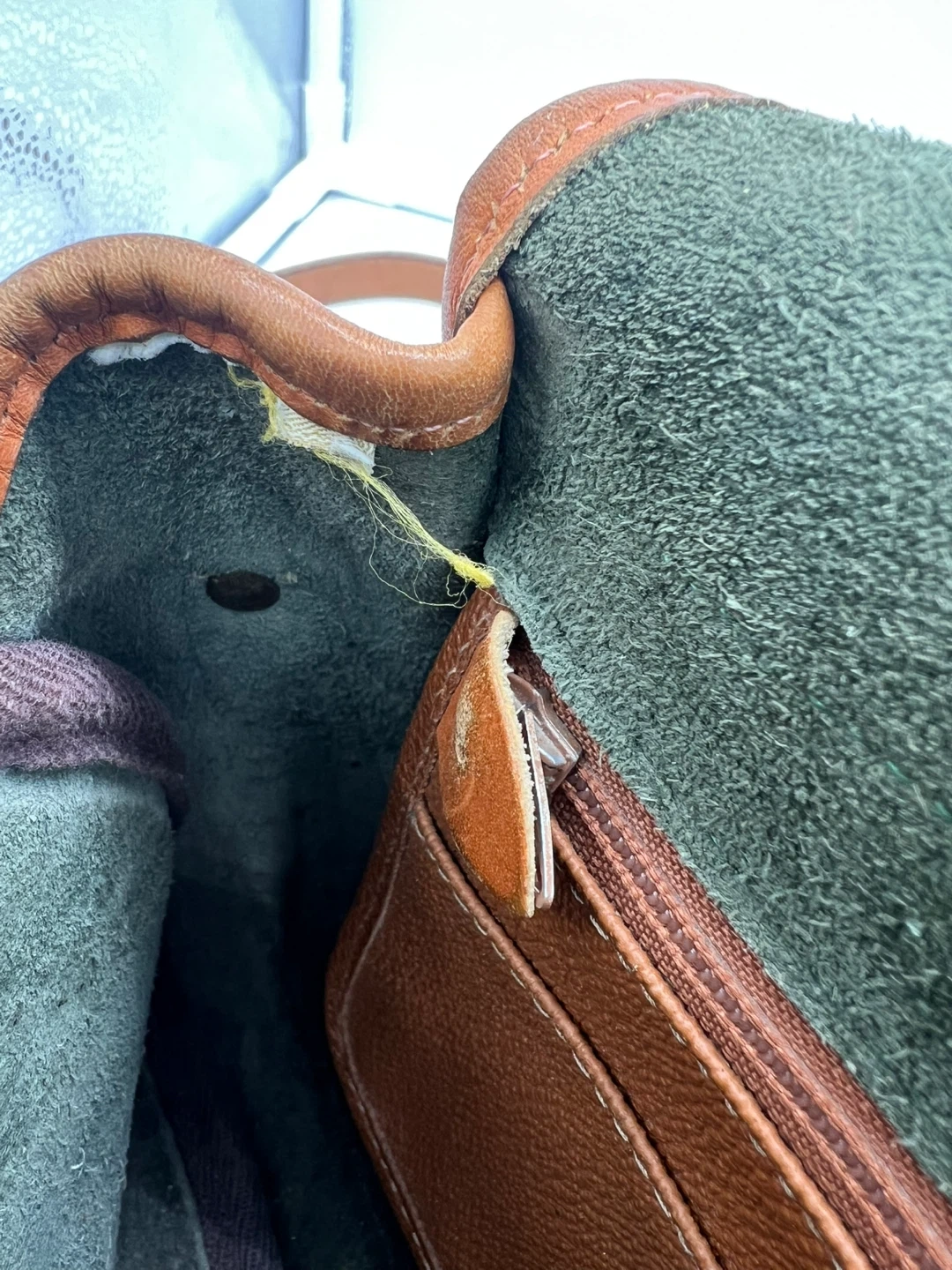 Inside tag has been cut off. Brass hardware has been polished. Dryness/fading/wear on the leather body. Faint marks on the inside.