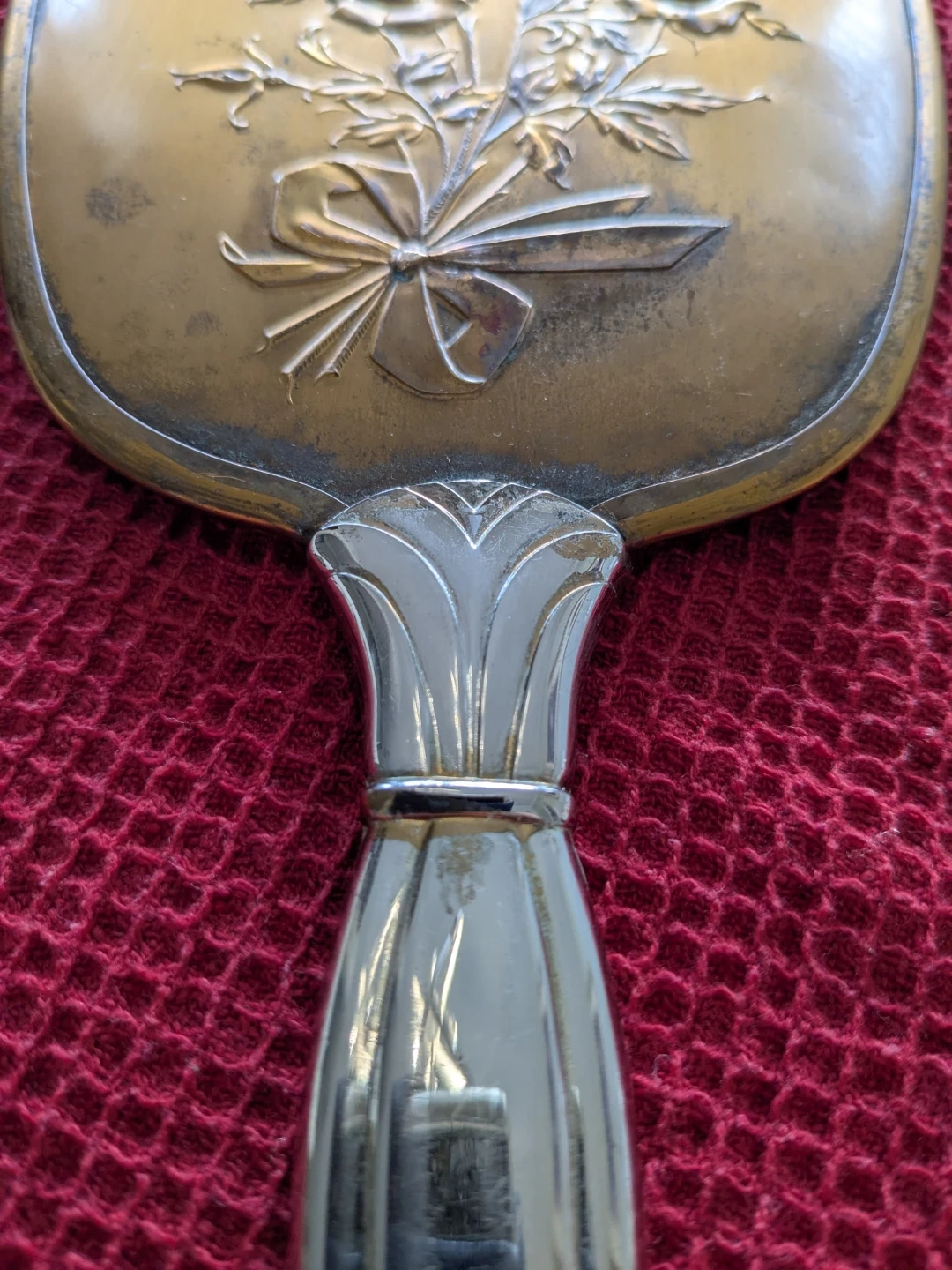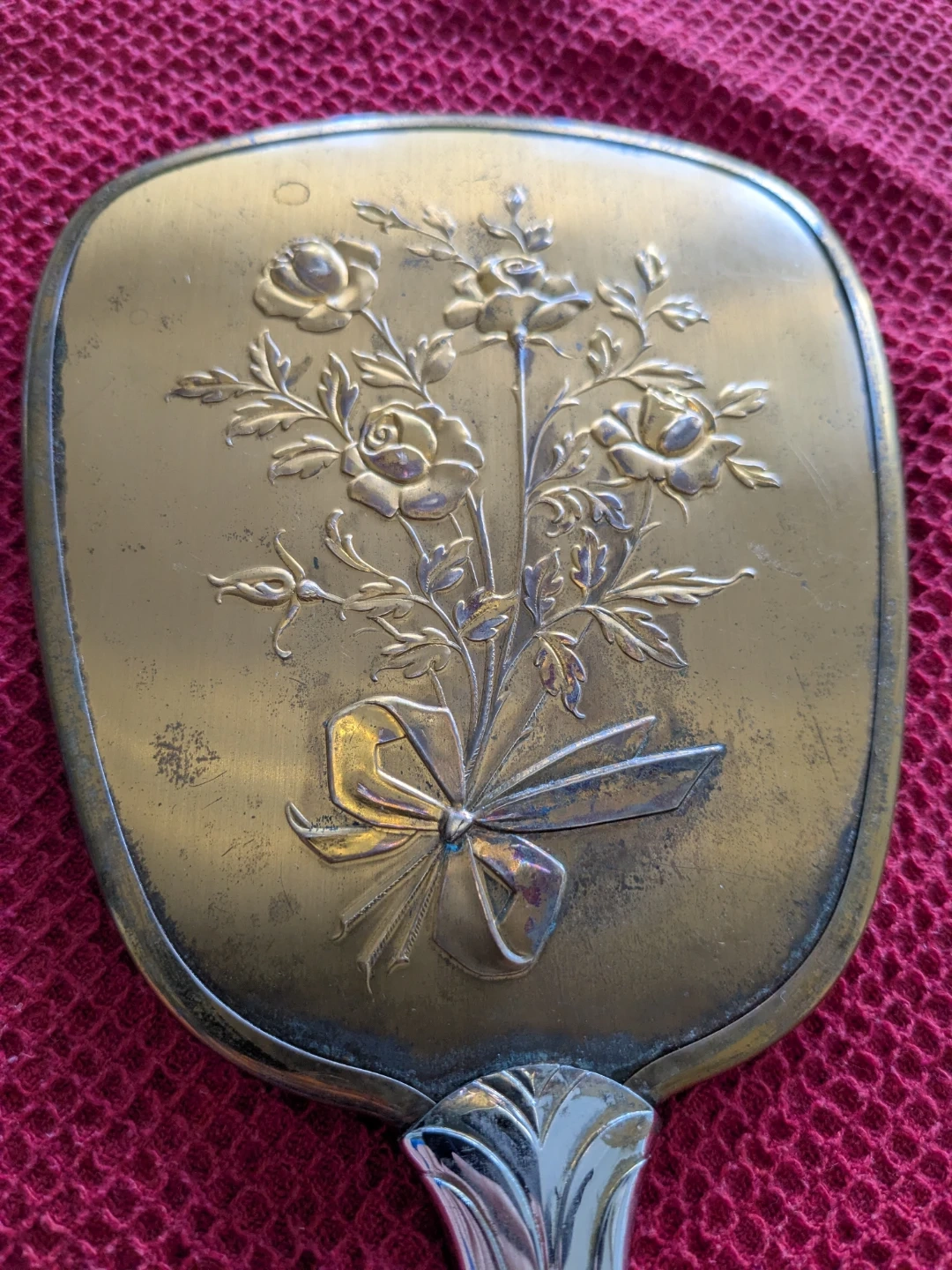 A vintage hand mirror featuring a beautiful embossed floral design and a silver-tone handle. It's made of metal with a decorative bouquet of roses and a bow. This mirror would be a lovely addition to a vanity.