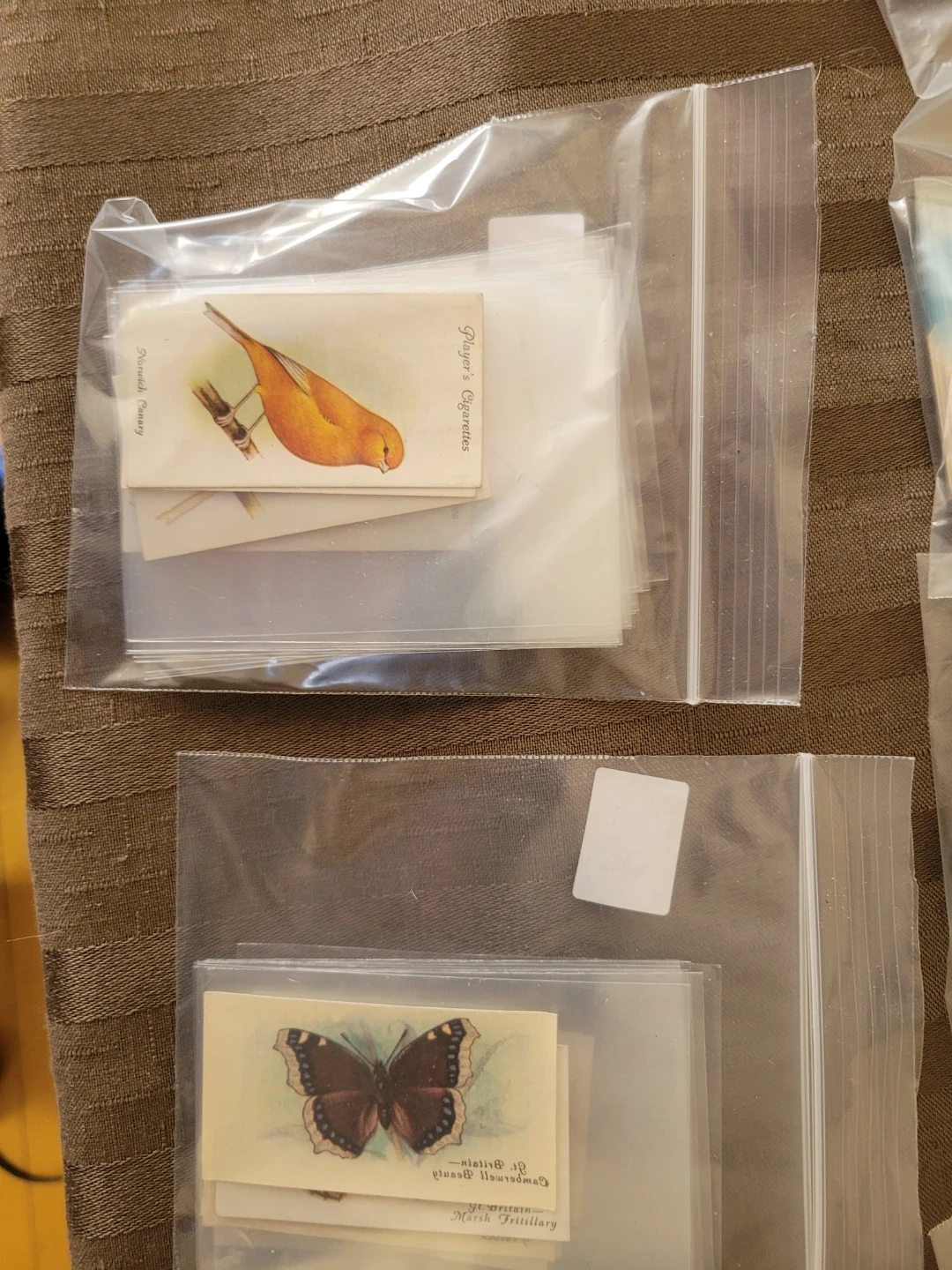 Collection of vintage illustrated trading cards featuring birds, butterflies, and flowers. Cards appear to be from various sets and brands. They're protected in individual plastic sleeves. A neat find for collectors!