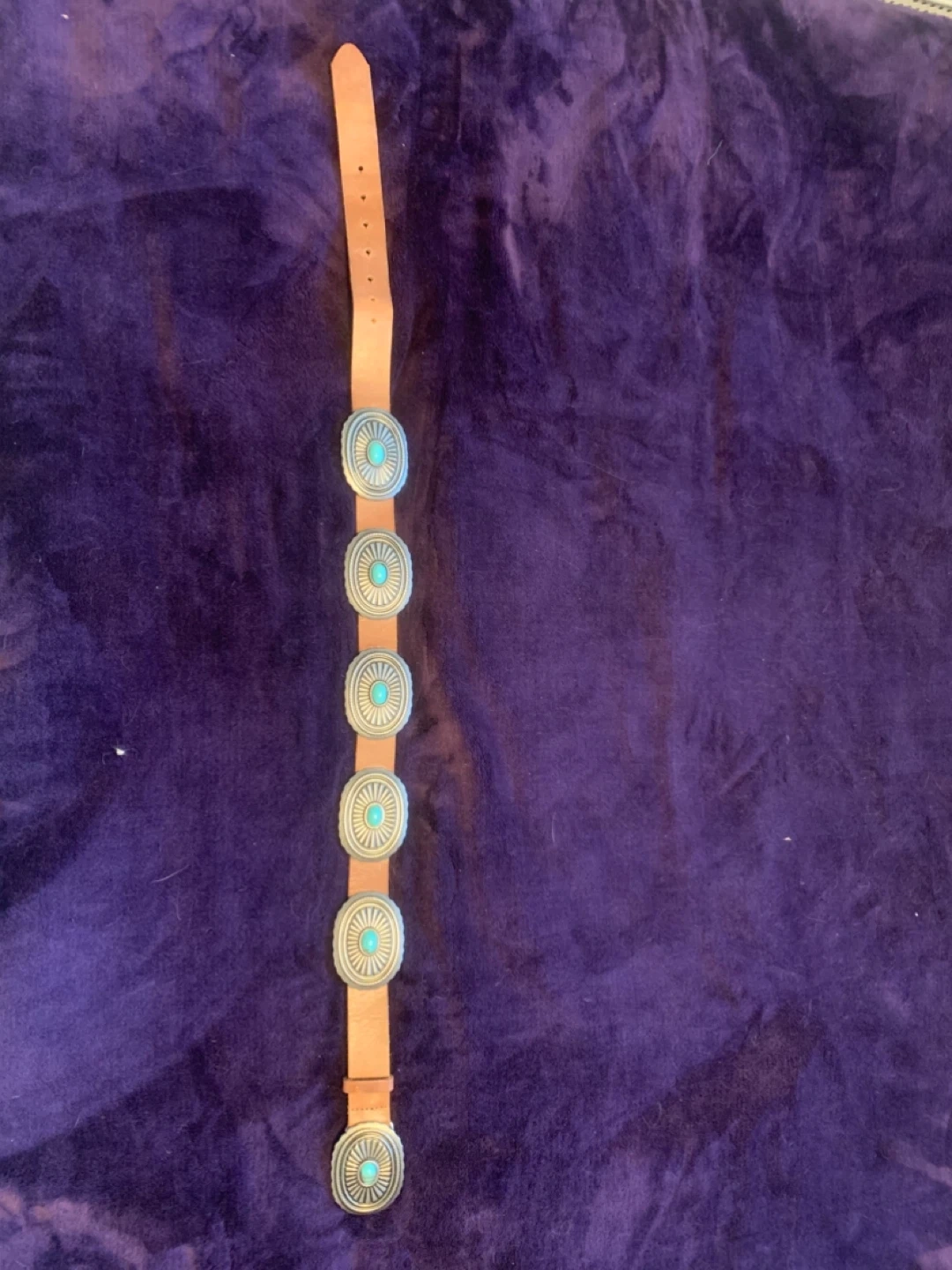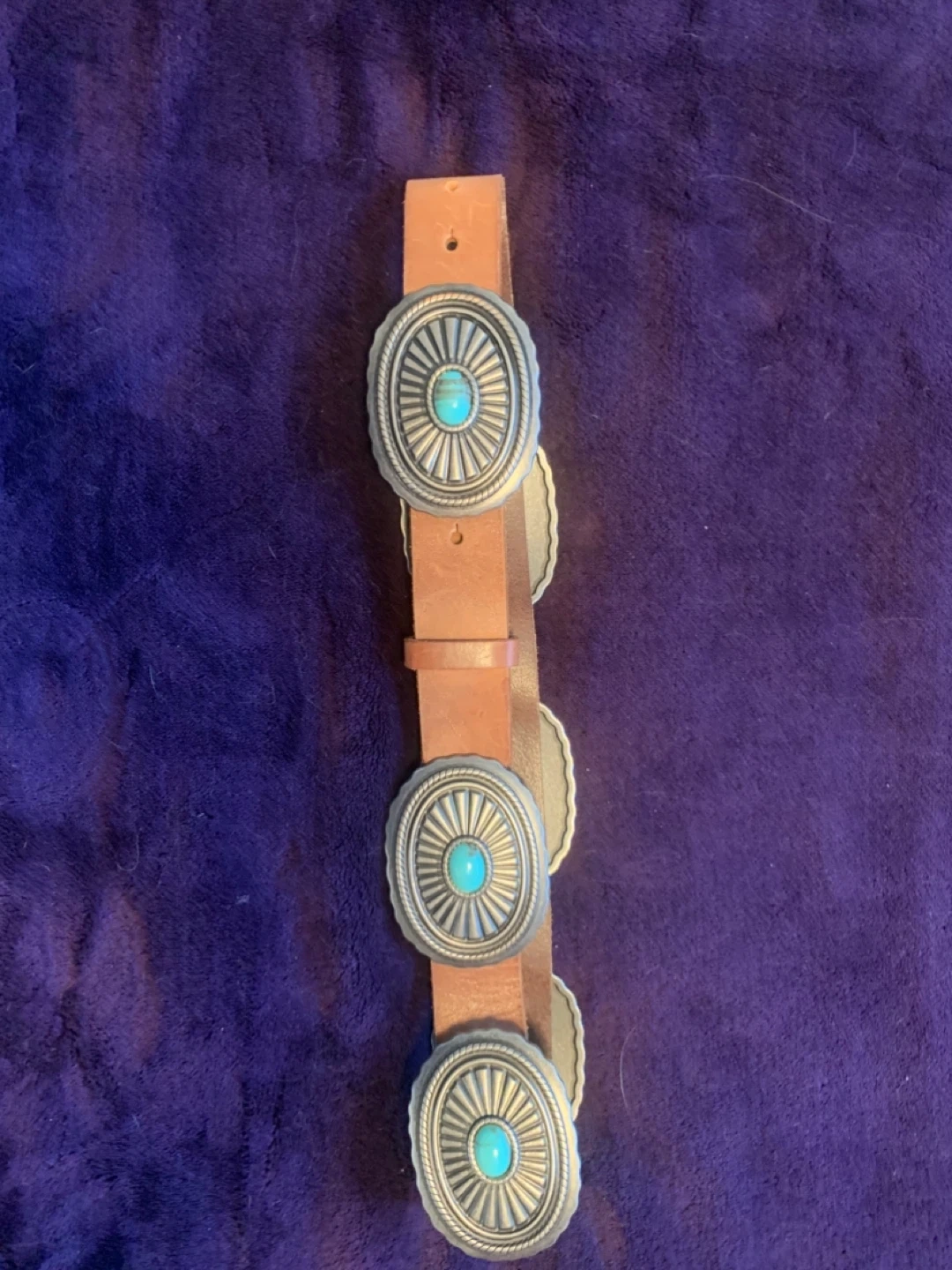 Brown leather belt with five silver-toned concho-style embellishments, each featuring a turquoise-like stone. Belt has multiple adjustment holes. Adds a Western flair to any outfit! One of the embellishments is missing a backing so it is loose, but still attached.
