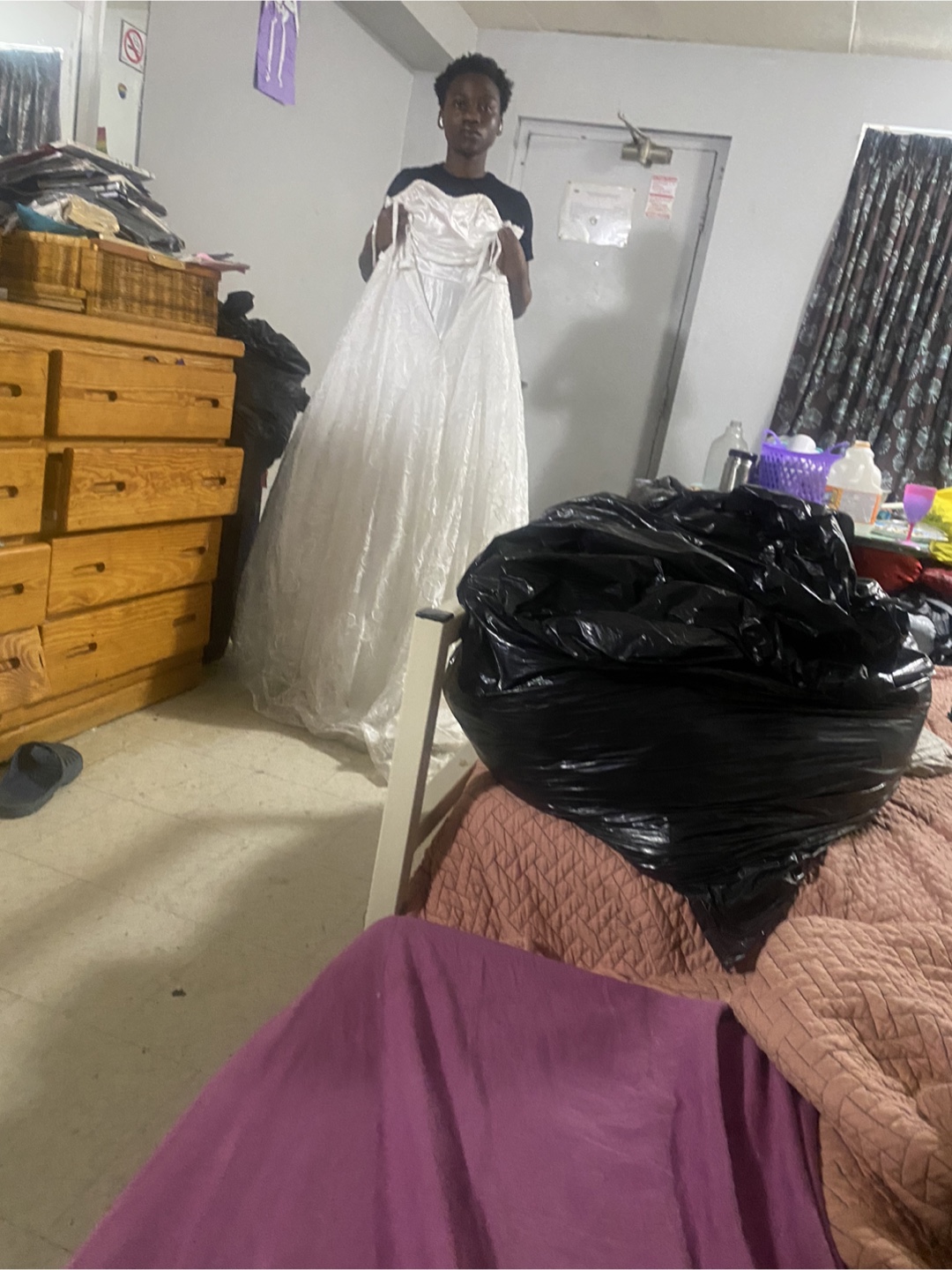 Selling a beautiful white wedding dress. It has a lovely floral pattern and a classic design. Perfect for your special day!