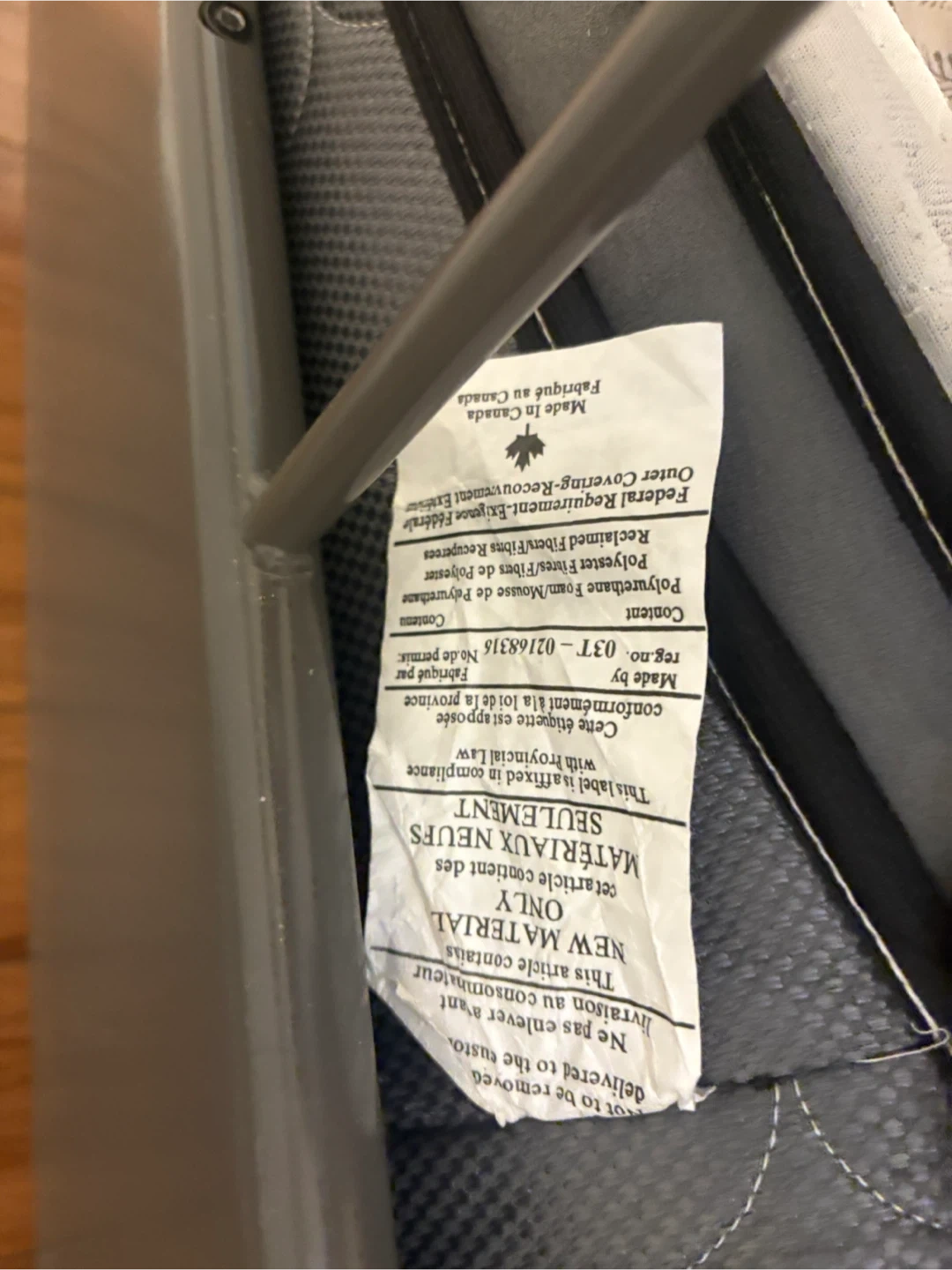 This mattress is made with new material only. It contains polyester fibres/fibres de polyester, polyurethane foam/mousse de polyuréthane, and reclaimed fibre/fibres recycles. It's made in Canada and conforms to provincial law