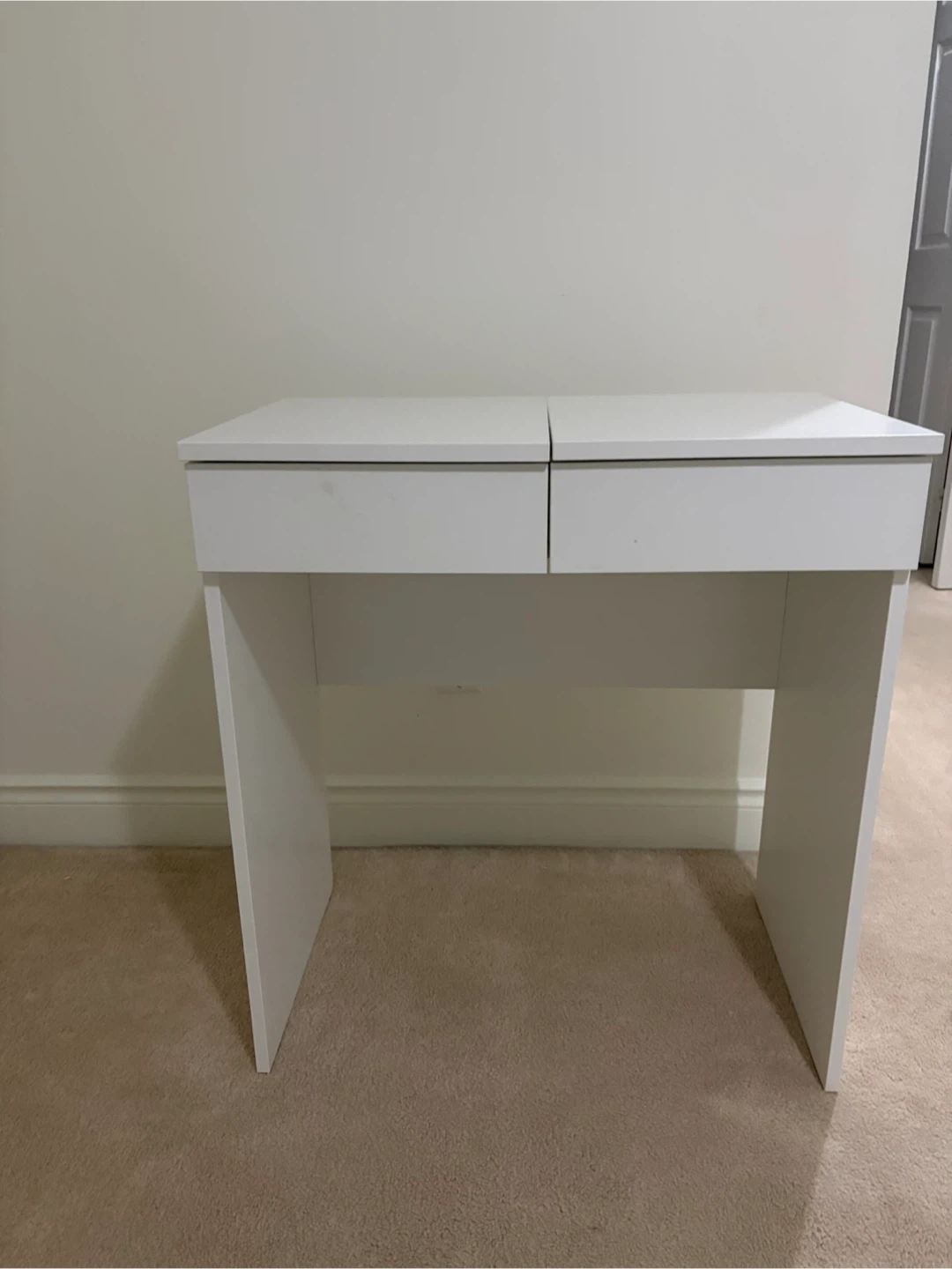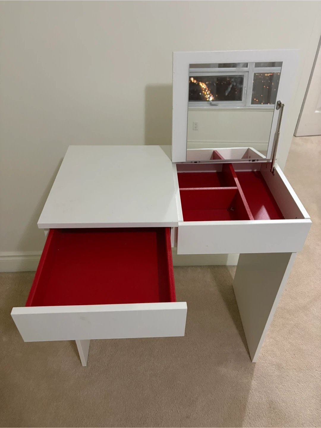 Selling a white vanity makeup table! It features a built-in mirror and drawers for storage. The interior of the drawers is a vibrant red, adding a pop of colour. Perfect for a bedroom or dressing area!