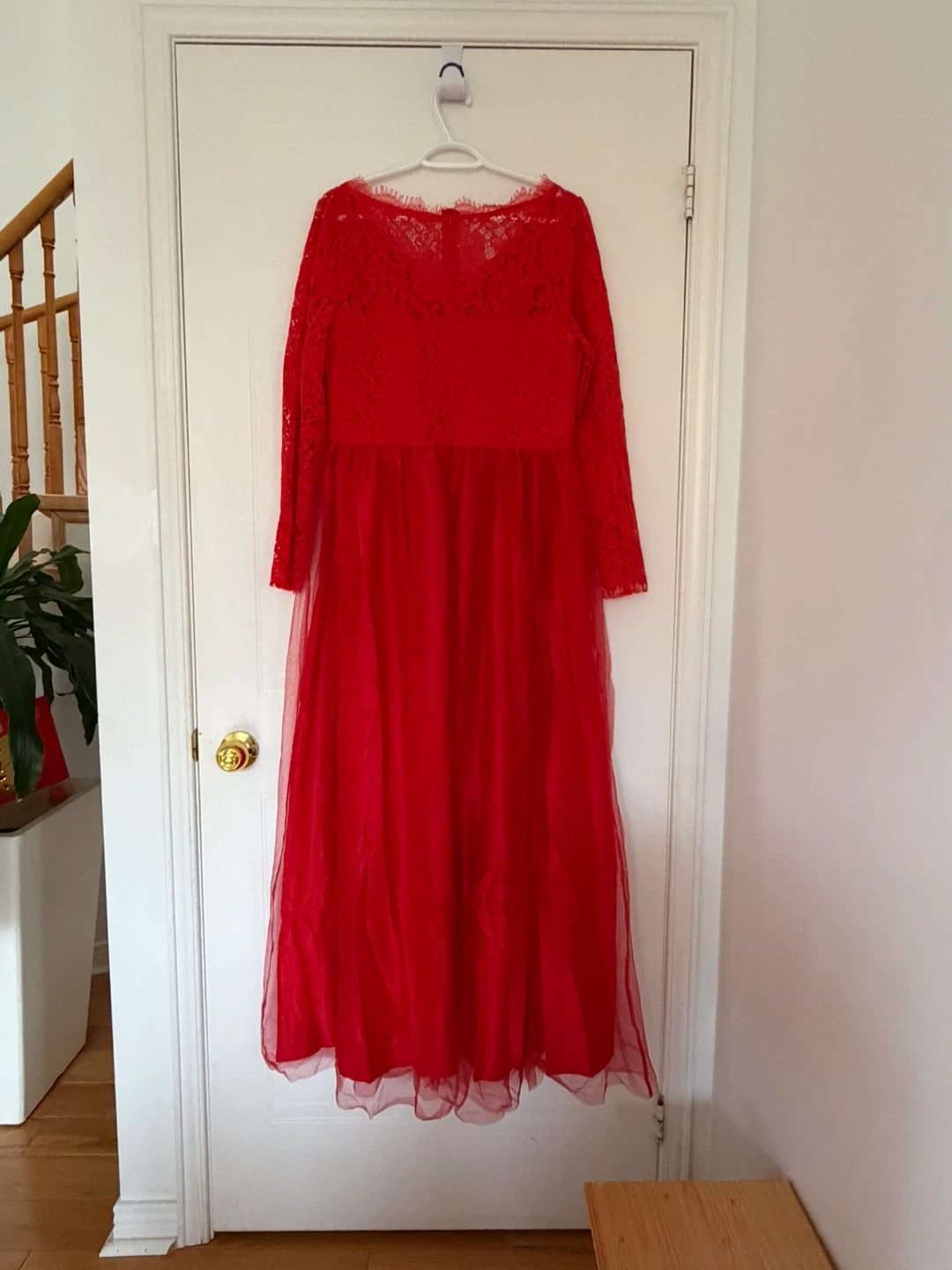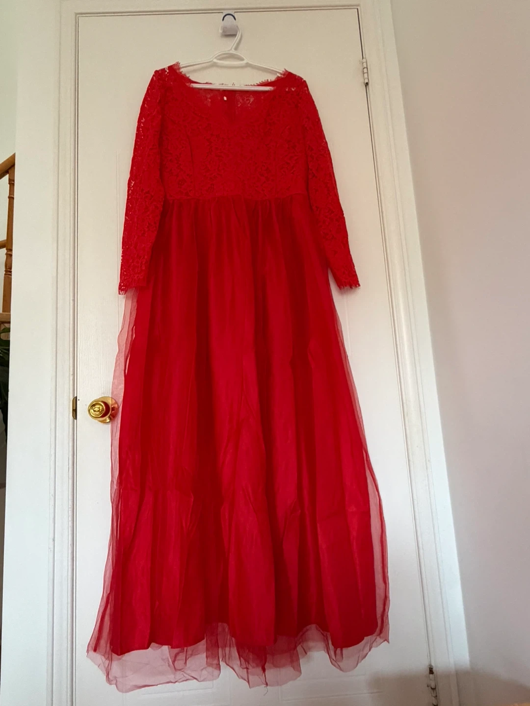 Beautiful red maxi dress featuring delicate lace detailing on the bodice and long sleeves. The skirt is made of flowing tulle. This dress is perfect for formal events or special occasions. It measures approximately 58 inches in length &chest 19 inches