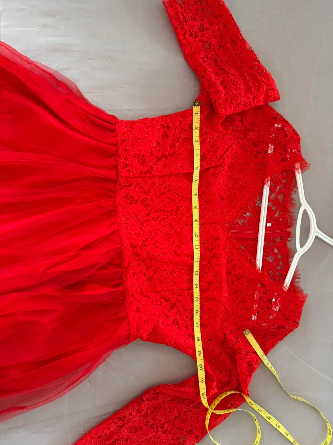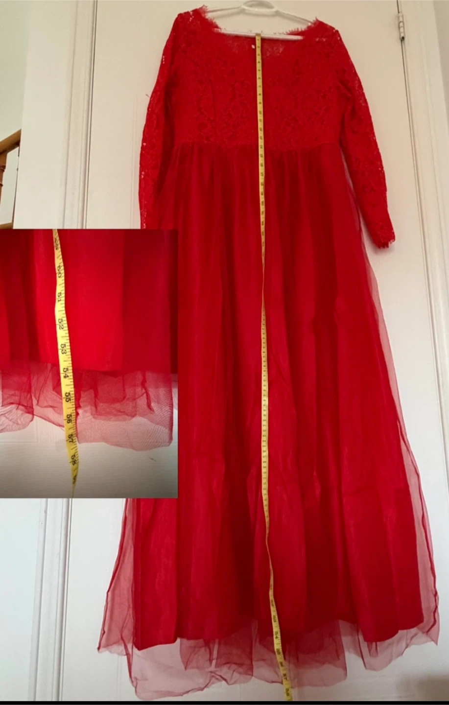 Beautiful red maxi dress featuring delicate lace detailing on the bodice and long sleeves. The skirt is made of flowing tulle. This dress is perfect for formal events or special occasions. It measures approximately 58 inches in length &chest 19 inches