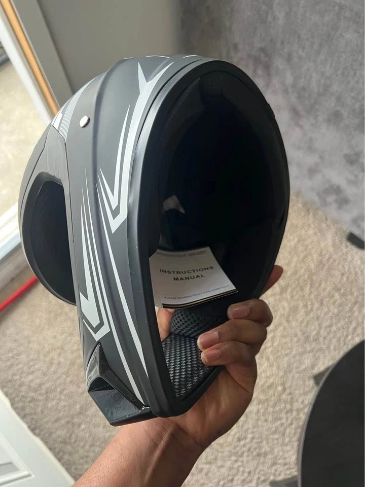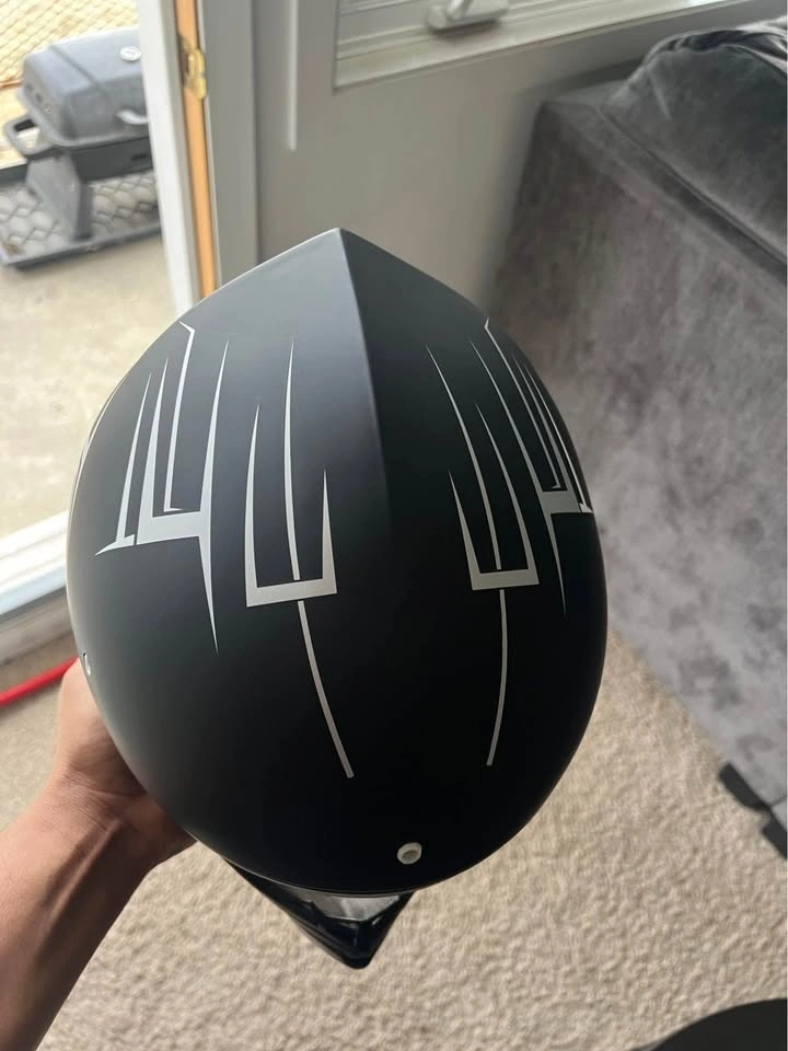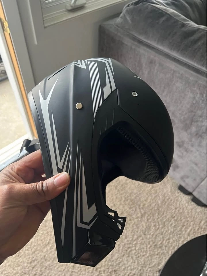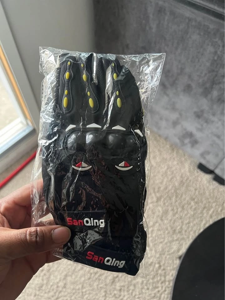 New helmet and gloves set. Black helmet has cool white and gray graphics. Comes with a fresh pair of San Qing gloves still in package.