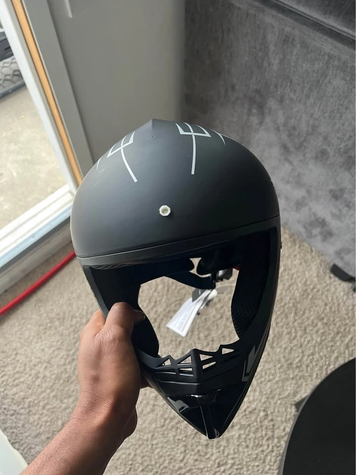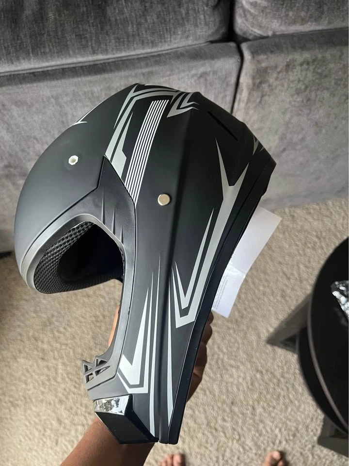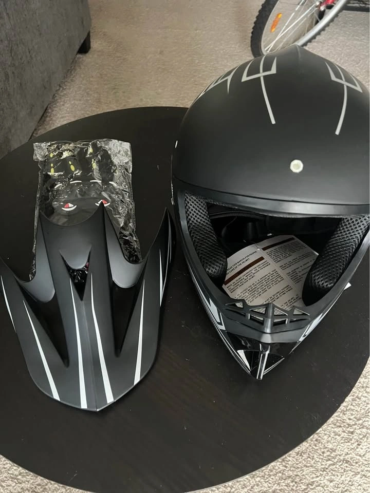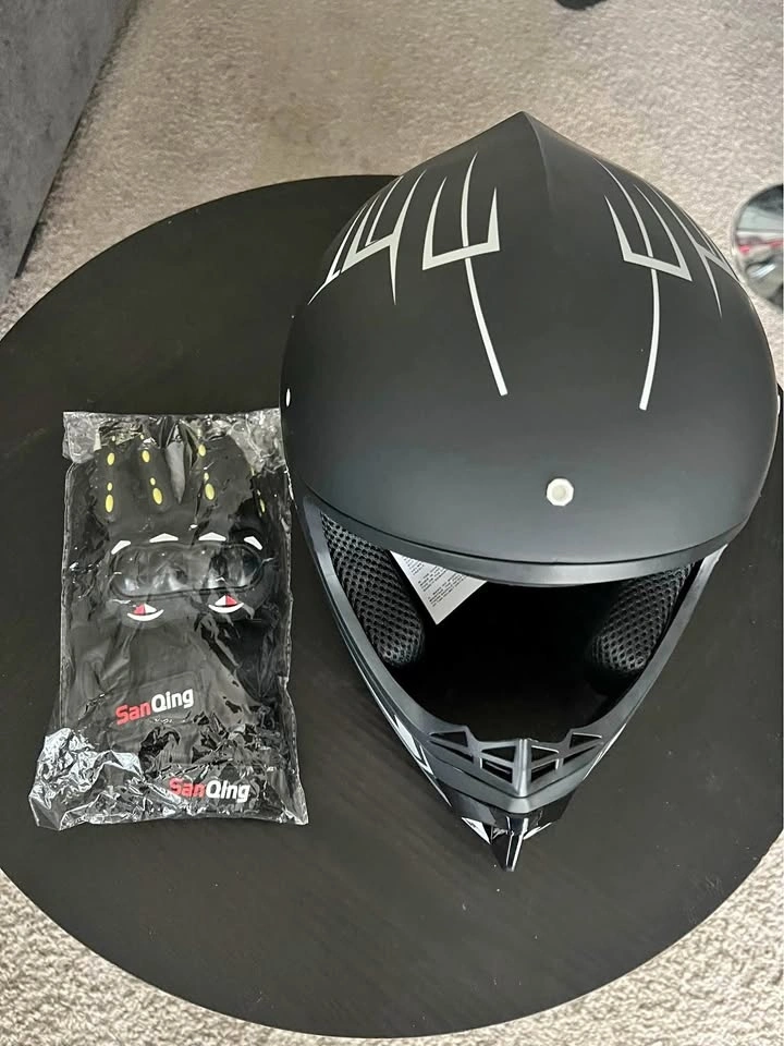 New helmet and gloves set. Black helmet has cool white and gray graphics. Comes with a fresh pair of San Qing gloves still in package.