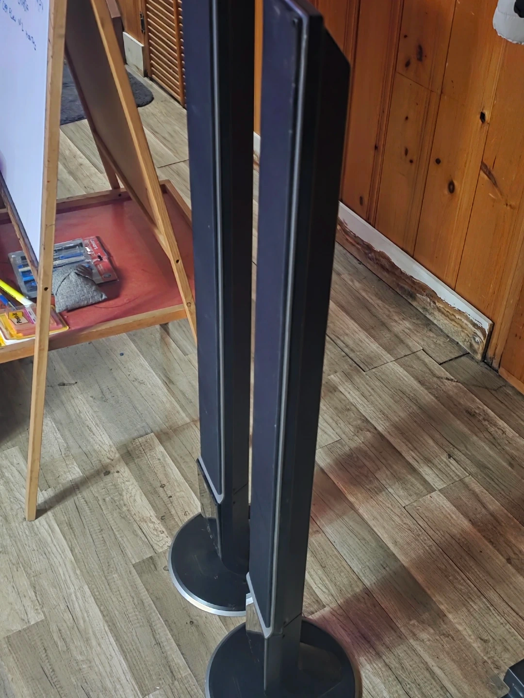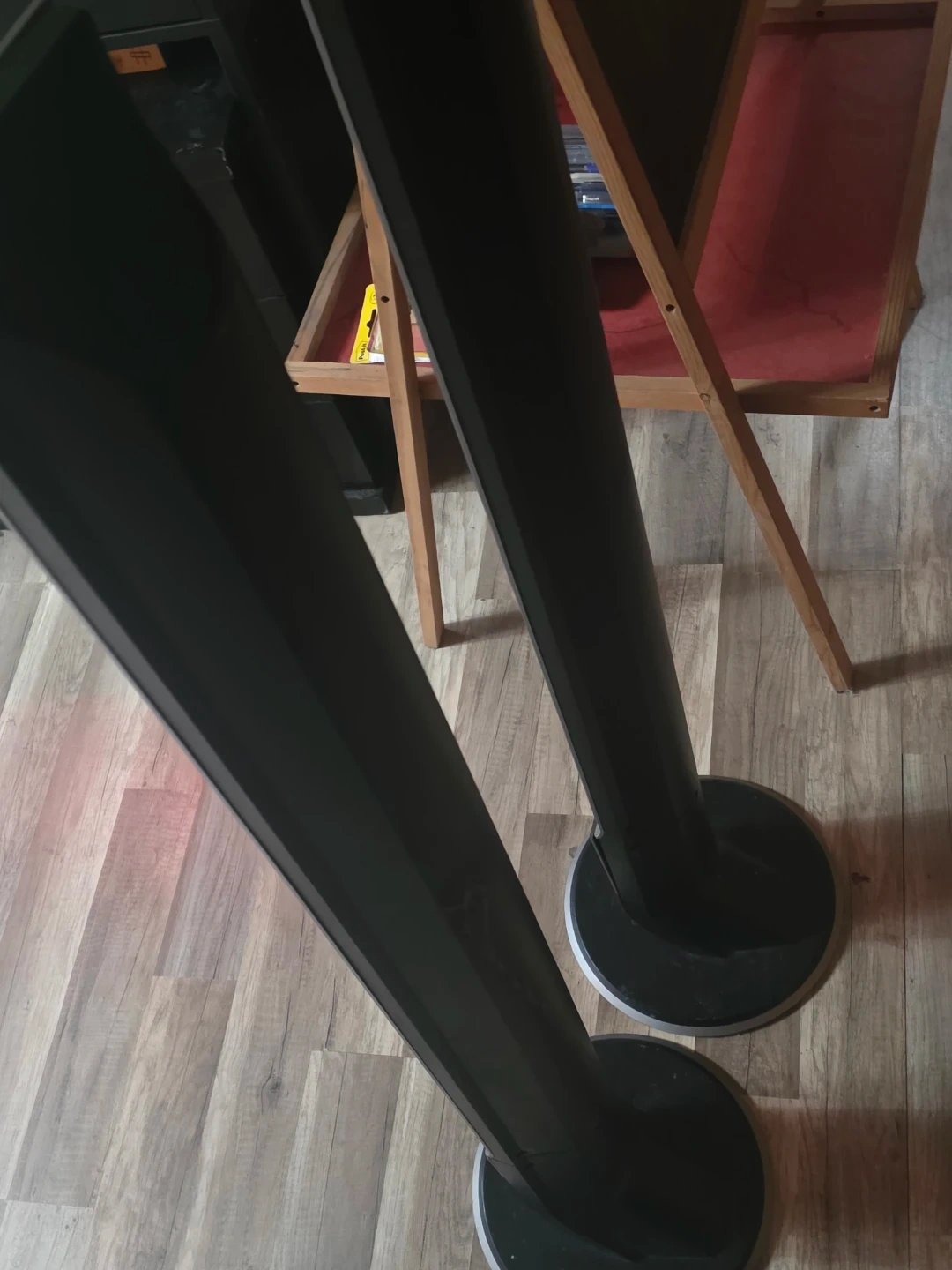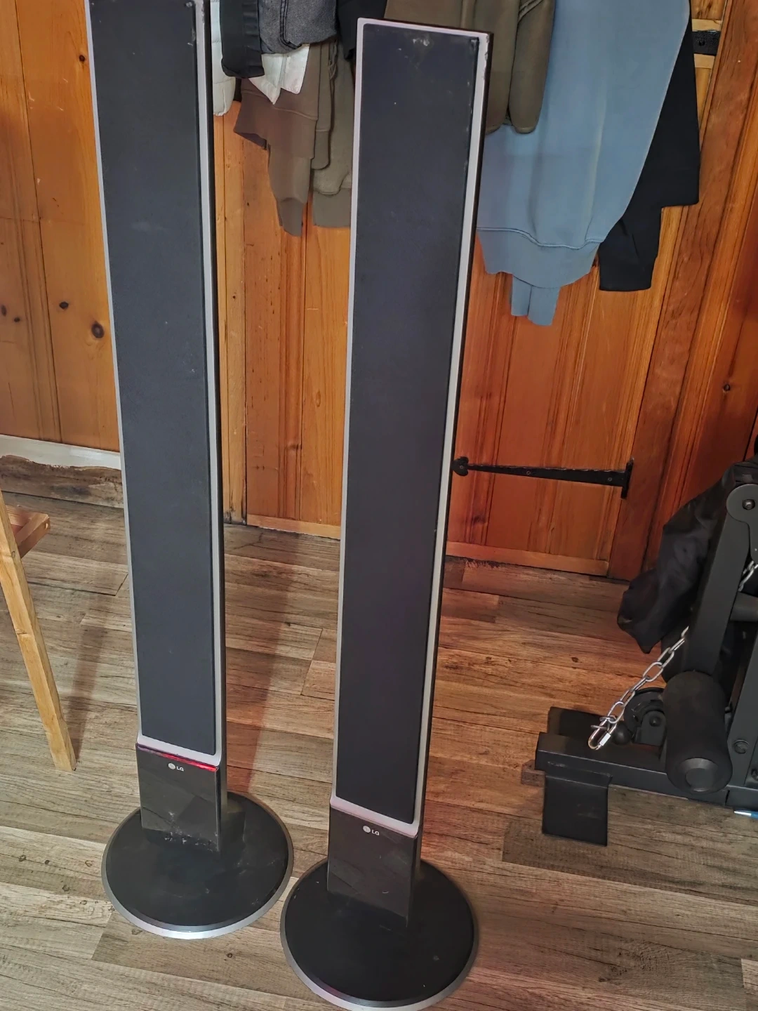 Pair of LG floor standing speakers. They're black with silver trim and a circular base. This set is great for enhancing your home audio experience!