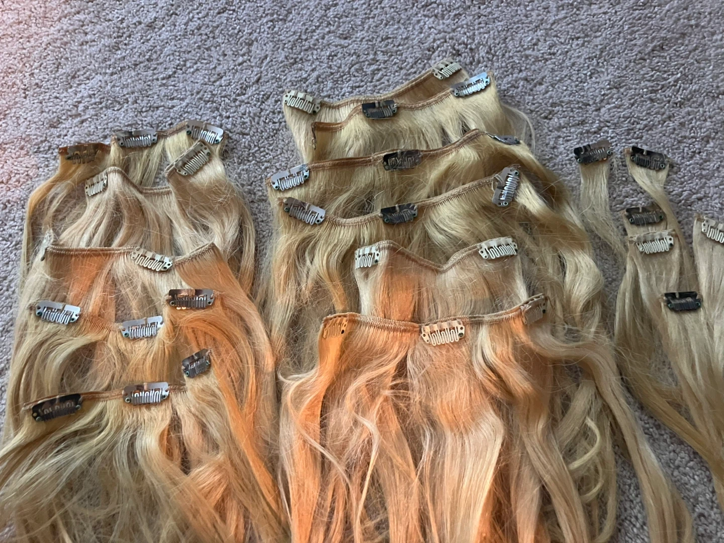 Two colours of clips included: metal and blonde; on a very soft seam. These extensions can be styled, washed, curled or straightened. Single clip pieces and longer (3 clip) pieces included. Length 8-12 inches.