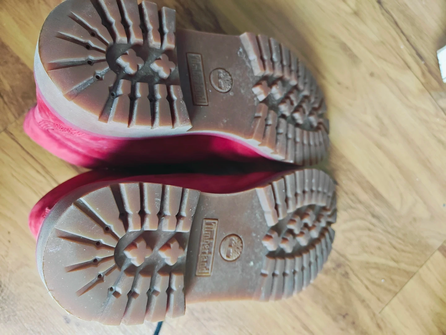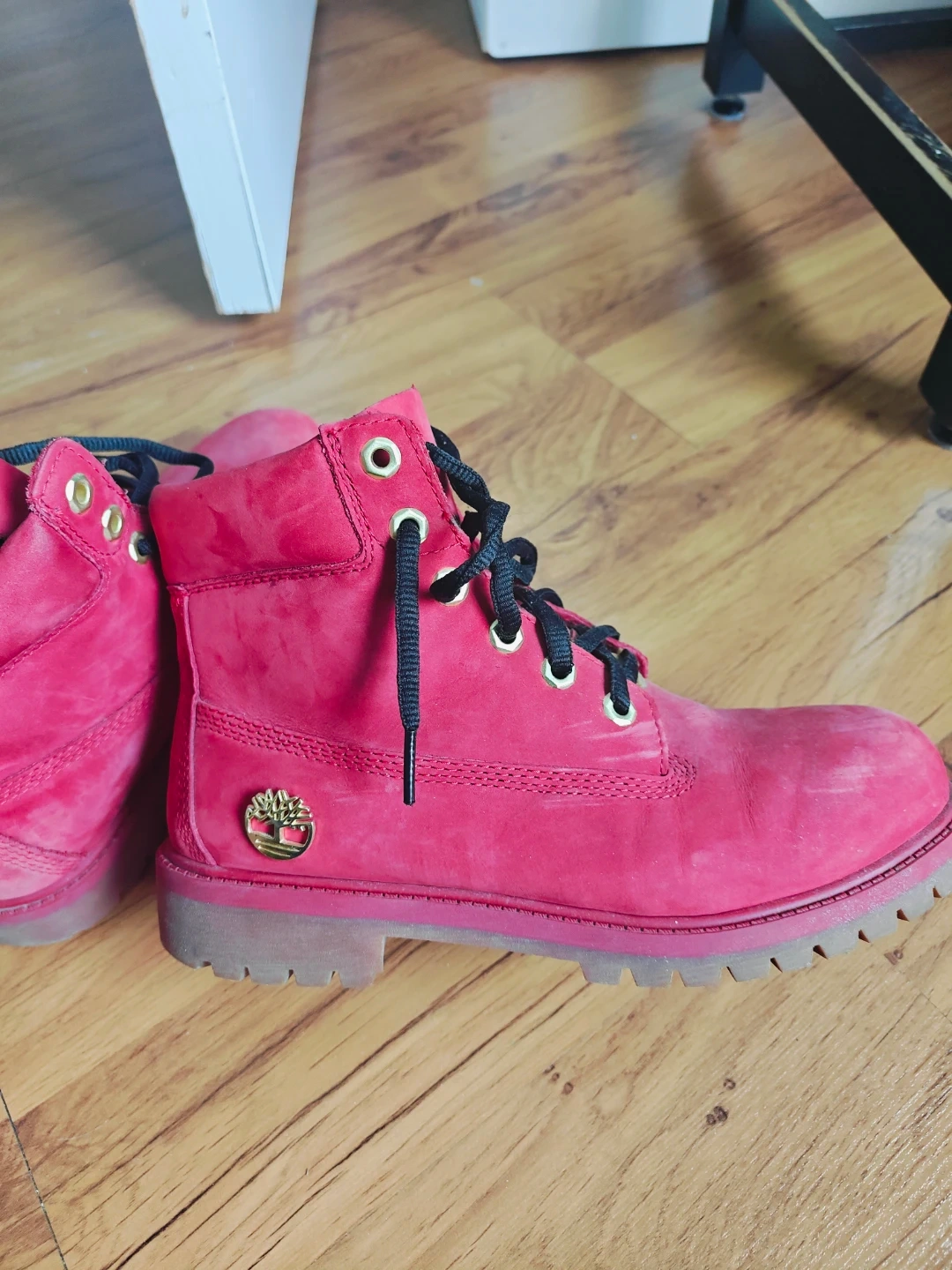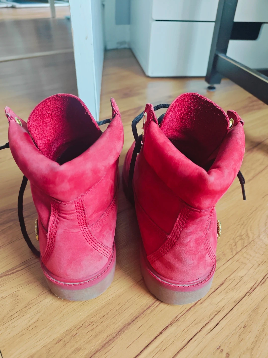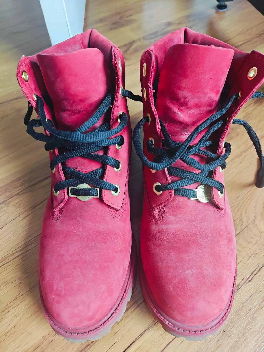Timberland classic lace-up boots in a vibrant red suede. No stains or damages. Features the iconic Timberland logo on the side. Durable rubber lug sole for traction. It's a stylish choice for cooler weather!