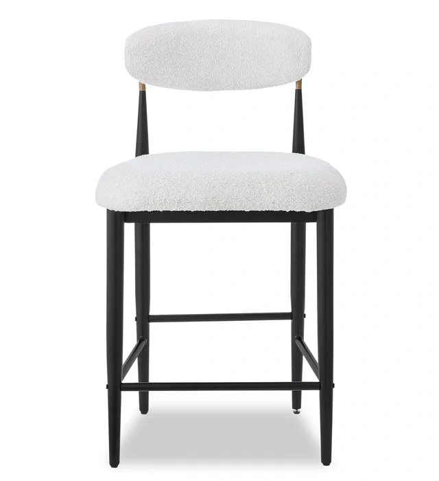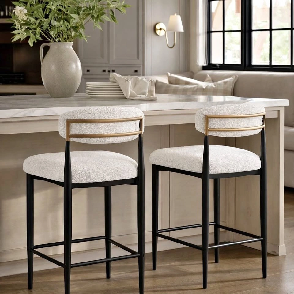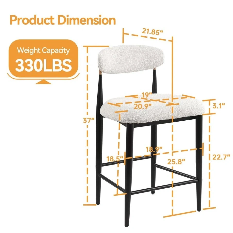 Set of two upholstered mid century modern (MCM) boucle counter stools with a metal frame, comfortable cushioned seats and foot rests. Brand new in box. Price listed is for the set of 2.