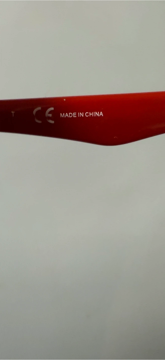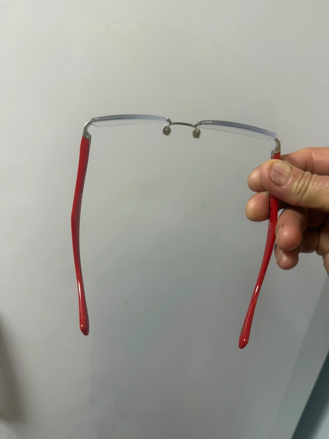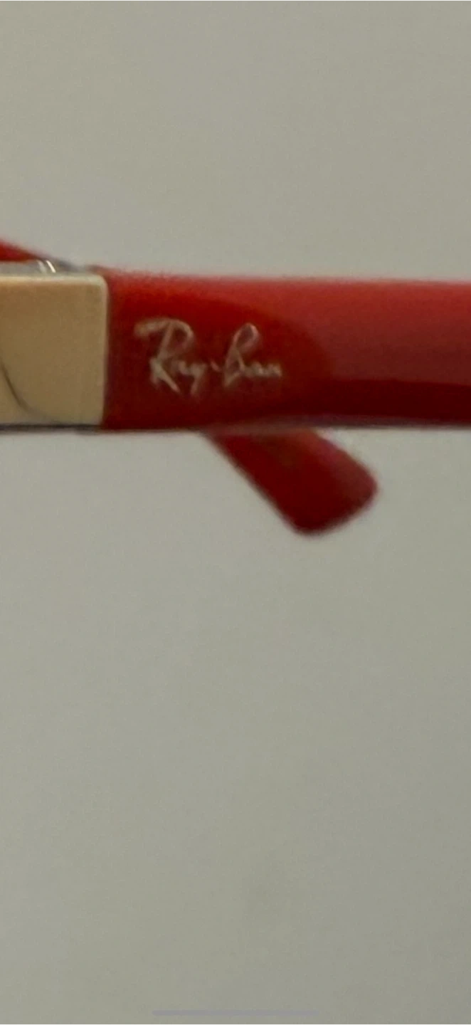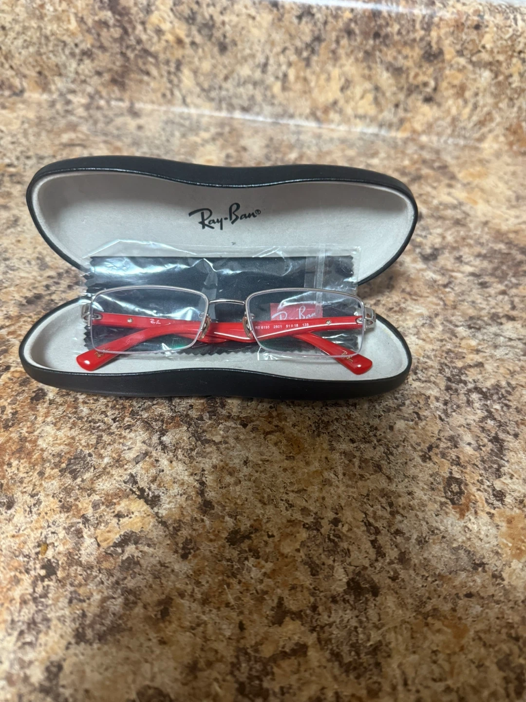 Ray-Ban eyeglasses with a red metal frame. Includes the original case and cleaning cloth. It's a half-rimmed style.