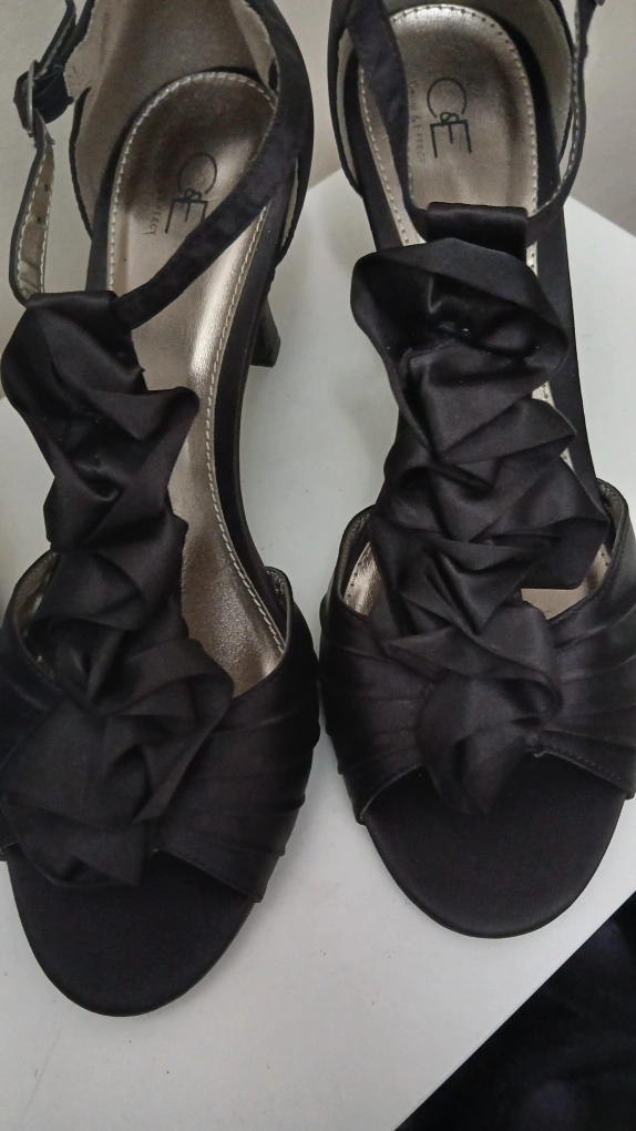 Elegant black satin heels. Size 10. Features a unique ruffle detail. used but in great condition.