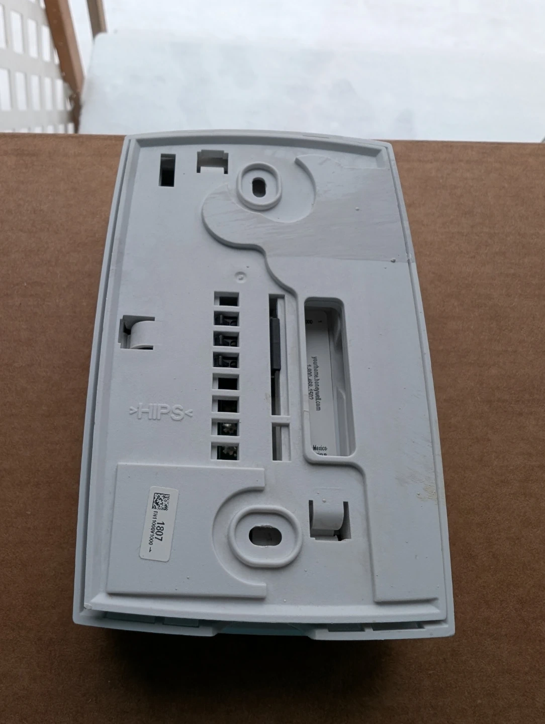This is a white Honeywell thermostat. It features a digital display and up/down arrow buttons for temperature control. Includes mounting base and wiring terminals. Used. *Does have a bit of primer on the side as shown in the photograph above.