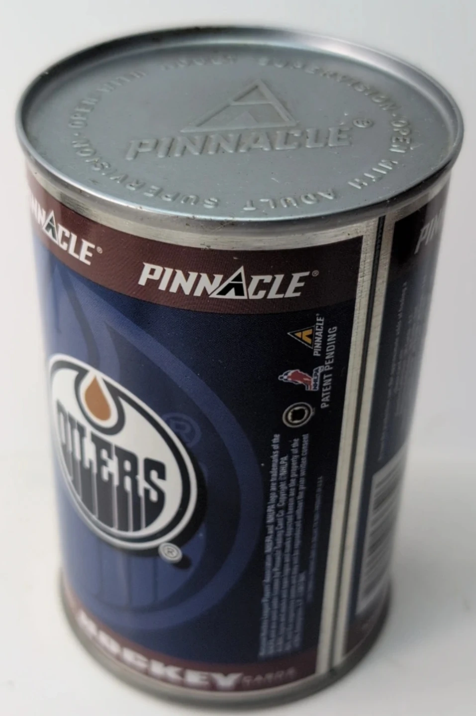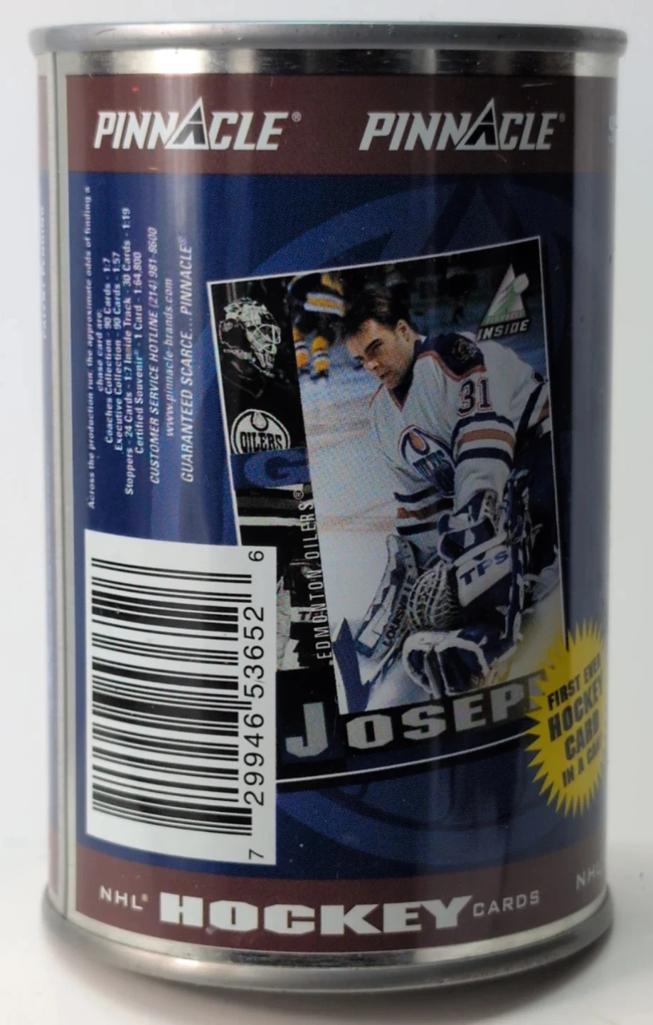 This is a 1997-98 Pinnacle NHL hockey cards can featuring the Edmonton Oilers. Each can contains 10 cards. It also includes a special "First Ever Hockey Card in a Can!".