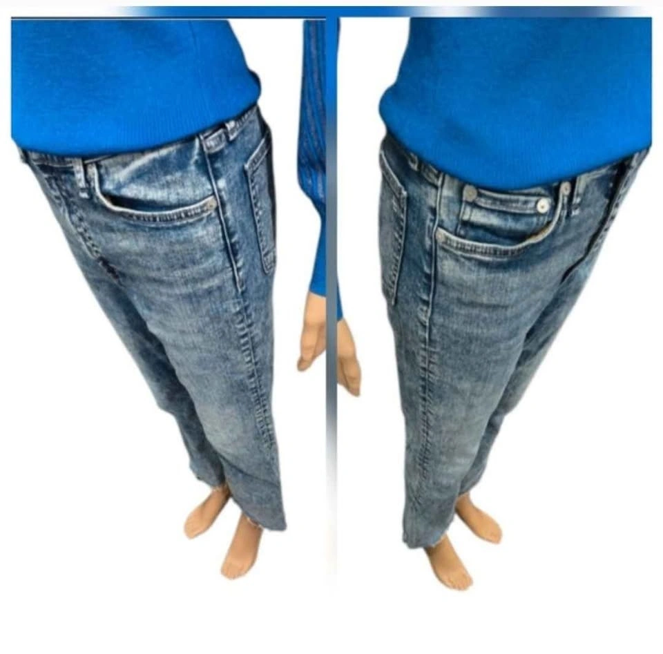 These jeans feature a high-rise, slim fit through the hip and thigh, opening into a subtle ankle flare. Classic 5-pocket styling, zip fly, and rag & bone branding.