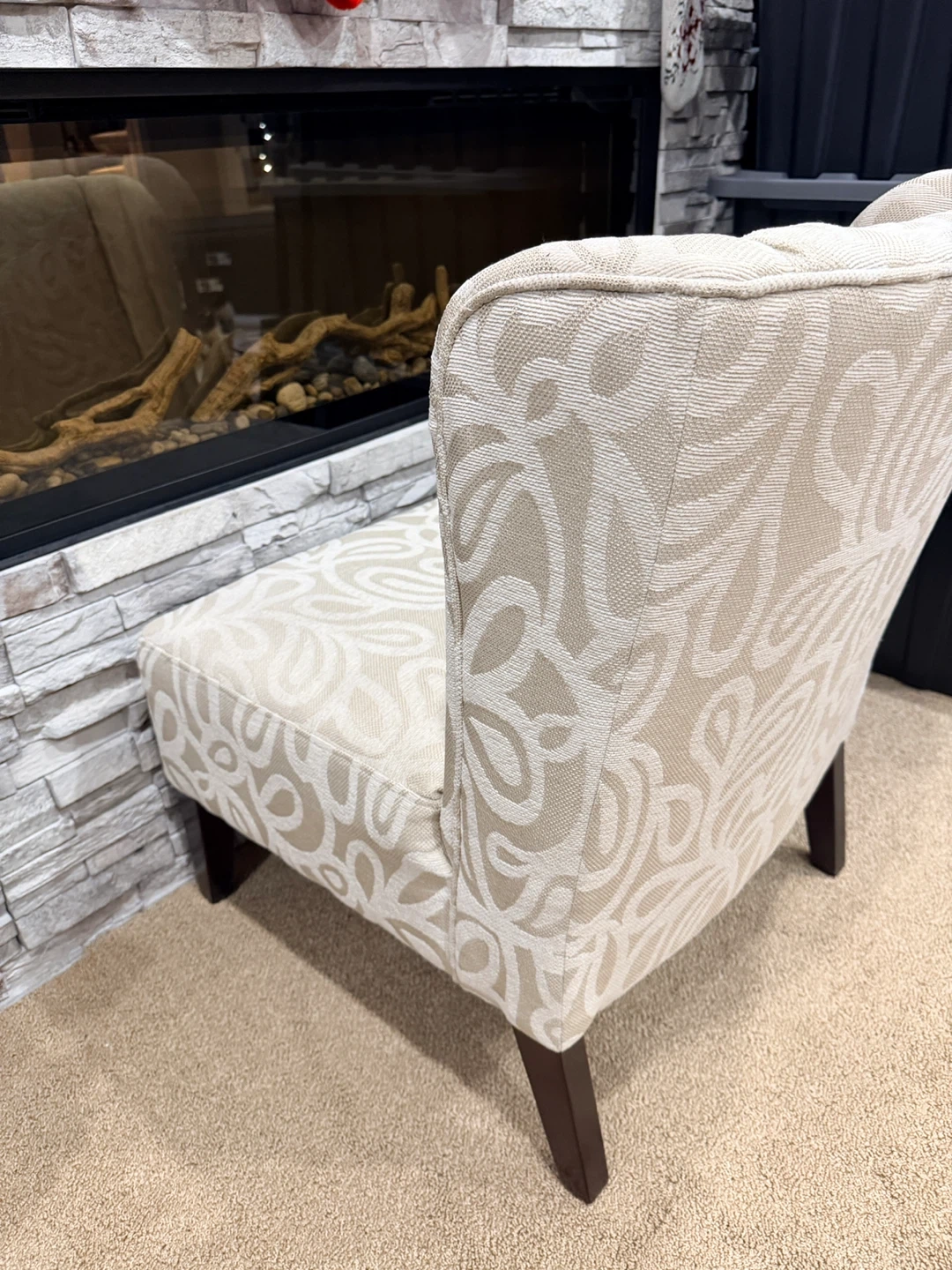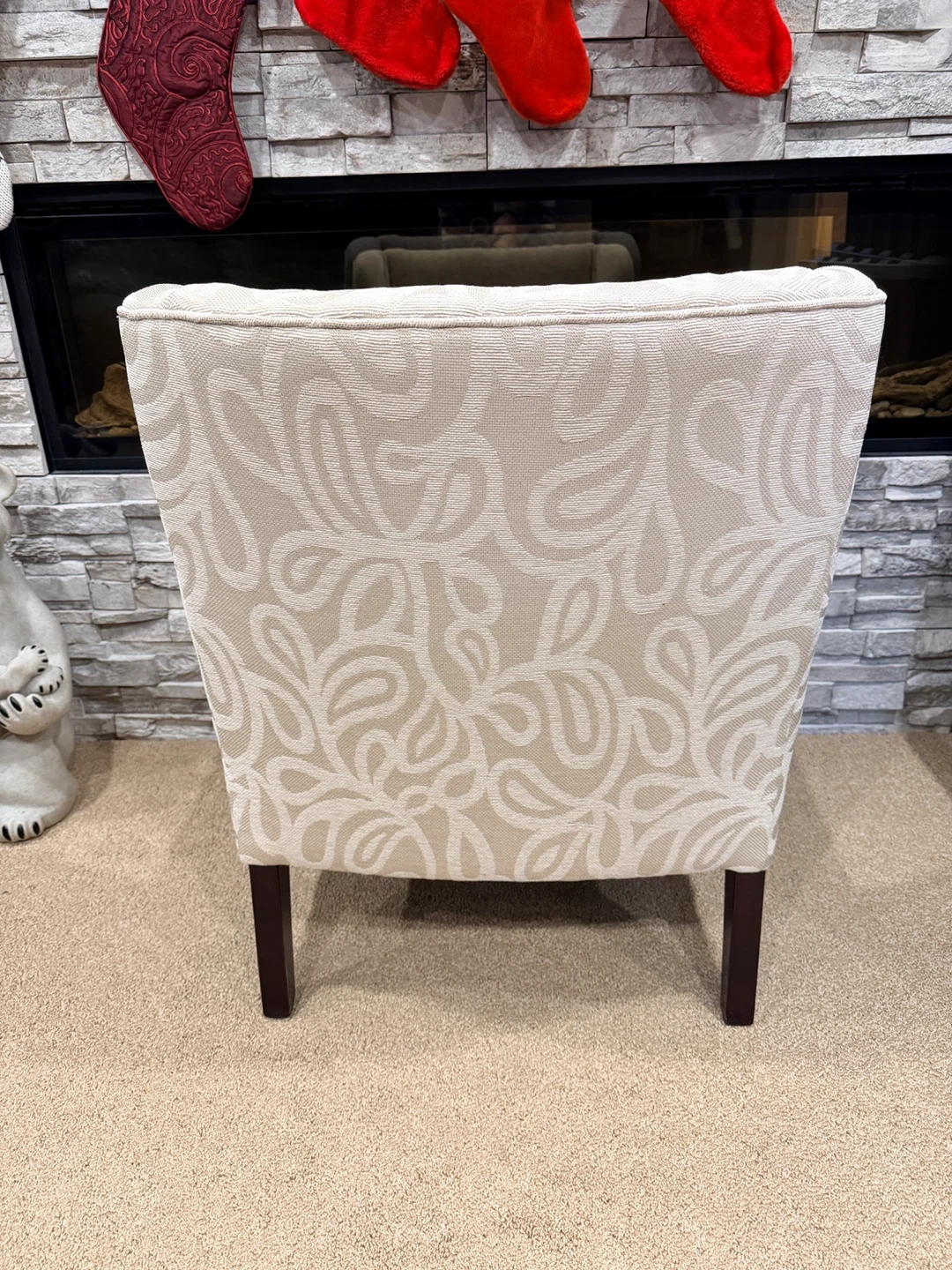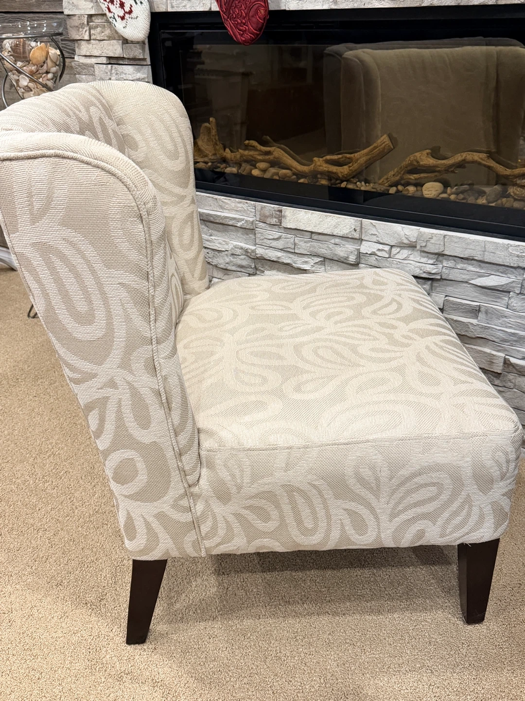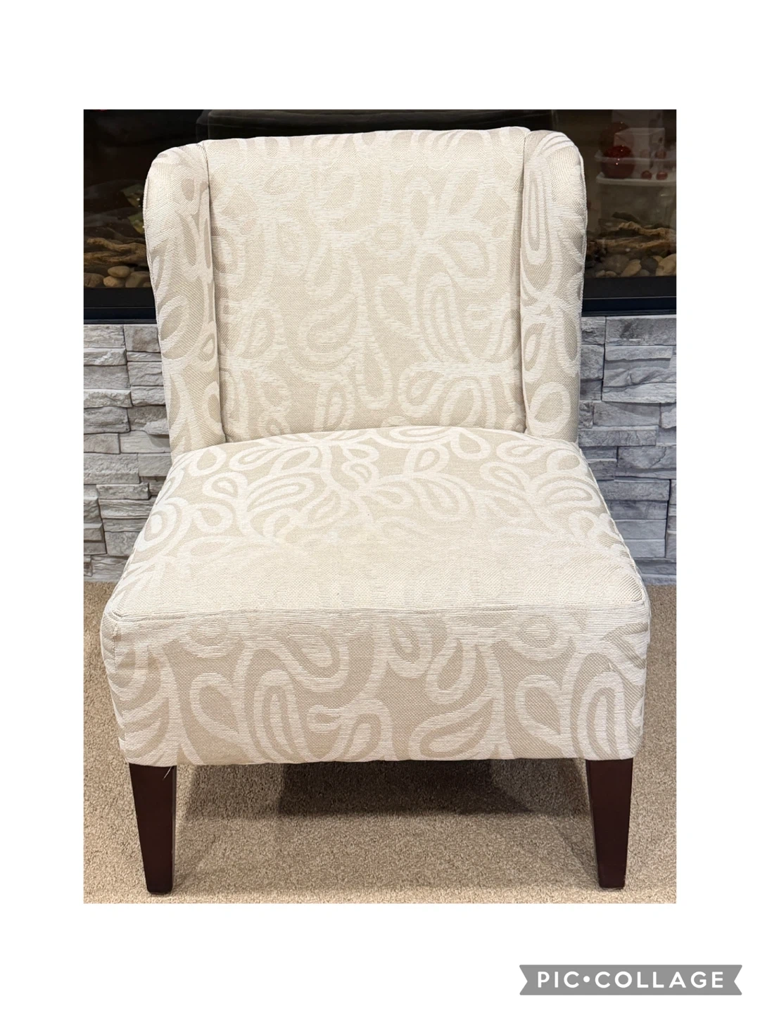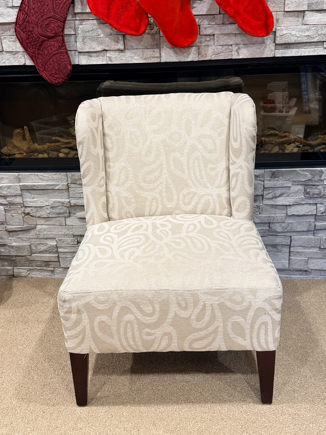 Selling a beige patterned armless accent chair in like-new condition. This stylish chair has been used lightly as an accent piece and is perfect for adding a pop of pattern and comfort to any room. Its neutral beige tones with subtle patterns make it easy to coordinate with a variety of décor styles.