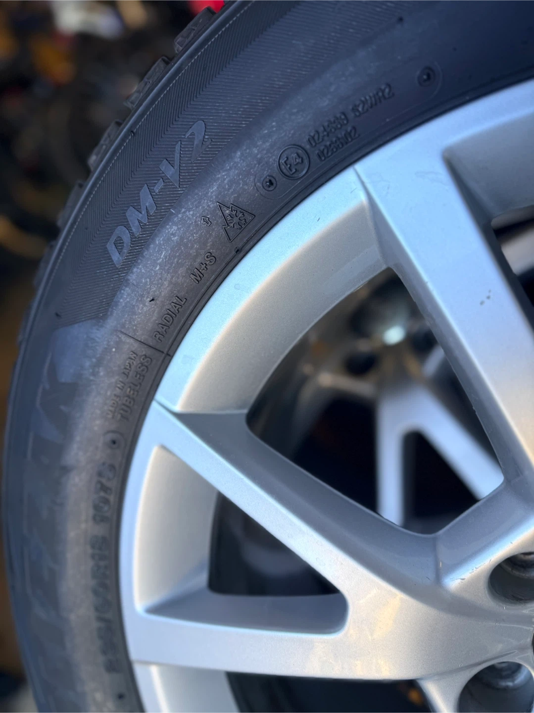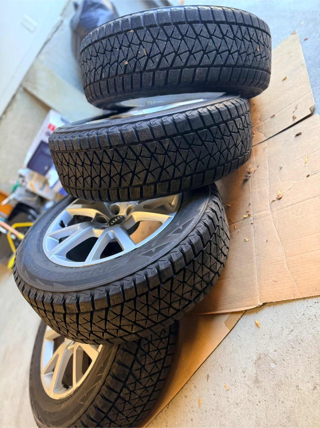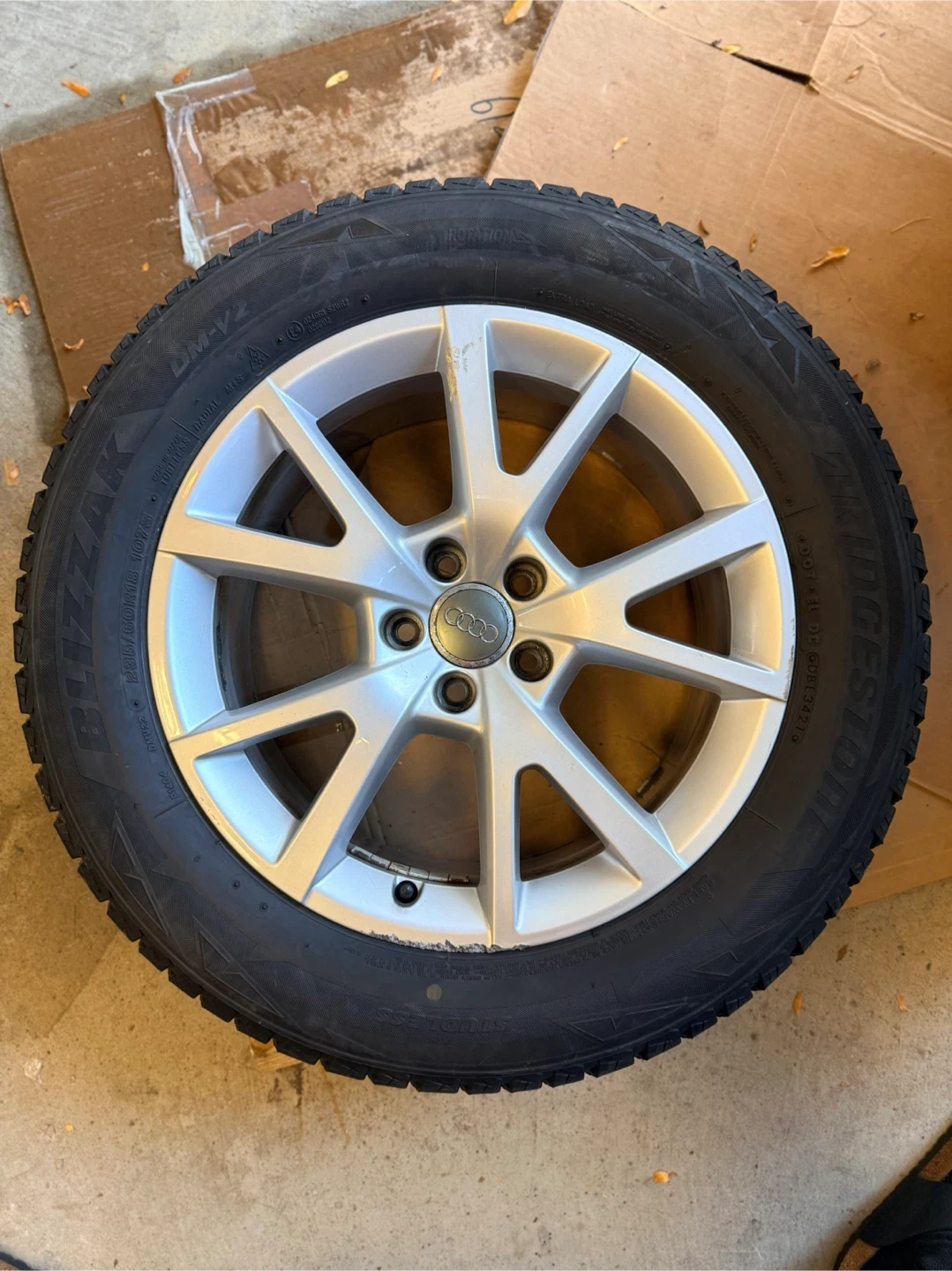 Selling a set of Audi rims paired with Bridgestone Blizzak DM-V2 tires. The tires are size 225/55R18. They show signs of wear and some damage to the rims, as seen in the photos. Great for winter driving!