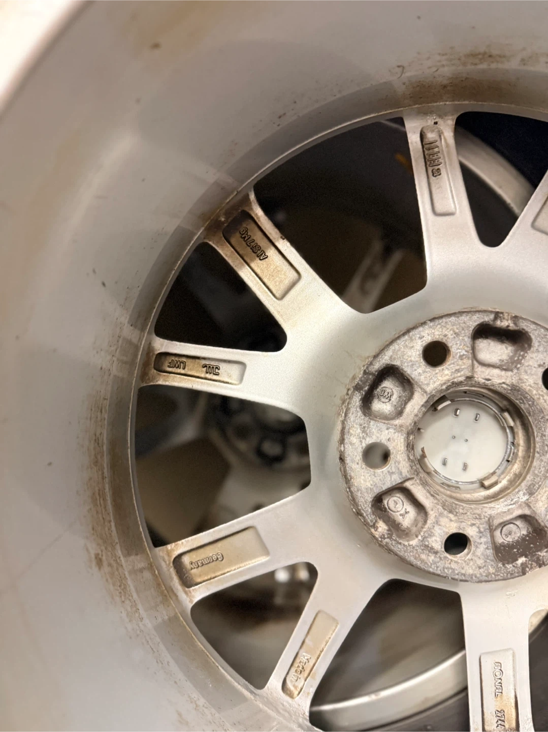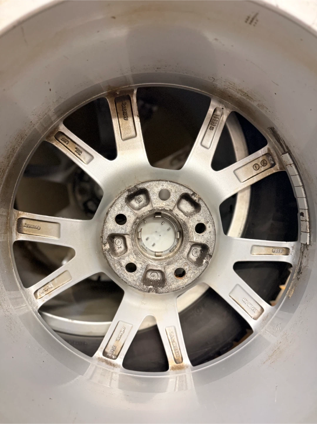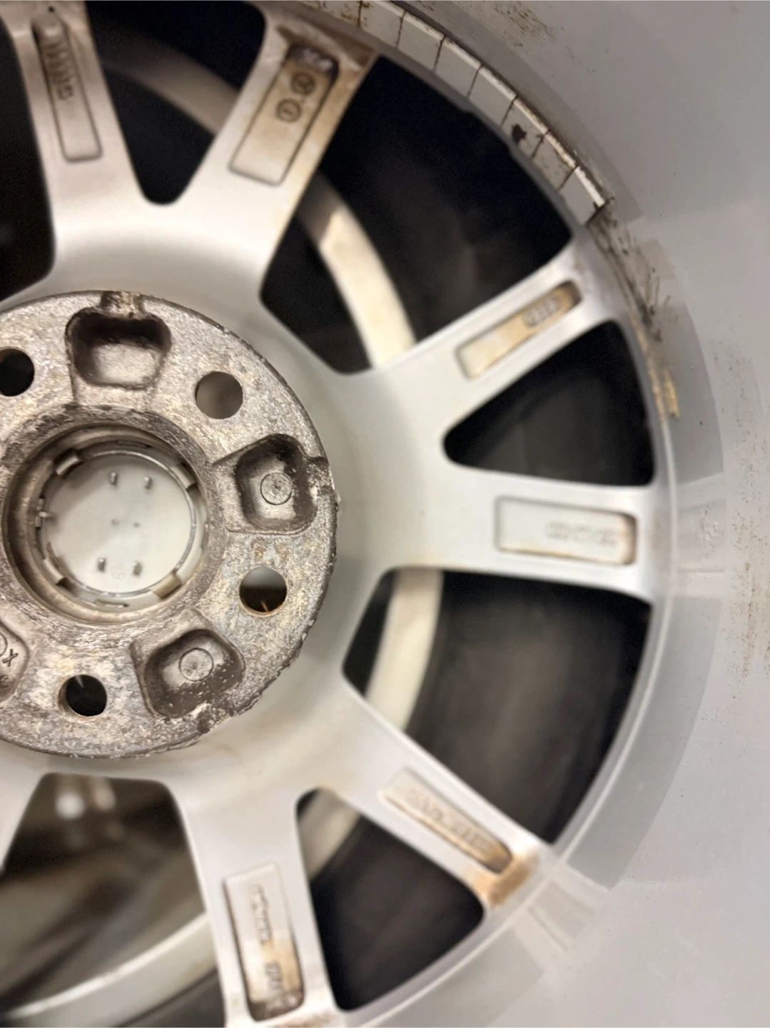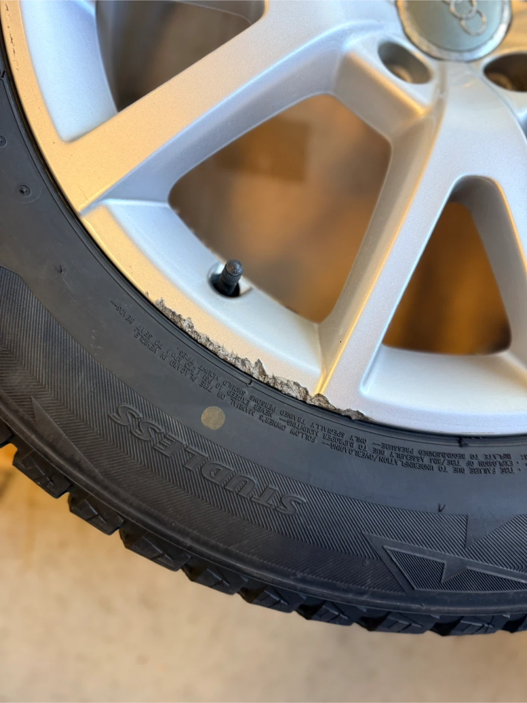 Selling a set of Audi rims paired with Bridgestone Blizzak DM-V2 tires. The tires are size 225/55R18. They show signs of wear and some damage to the rims, as seen in the photos. Great for winter driving!