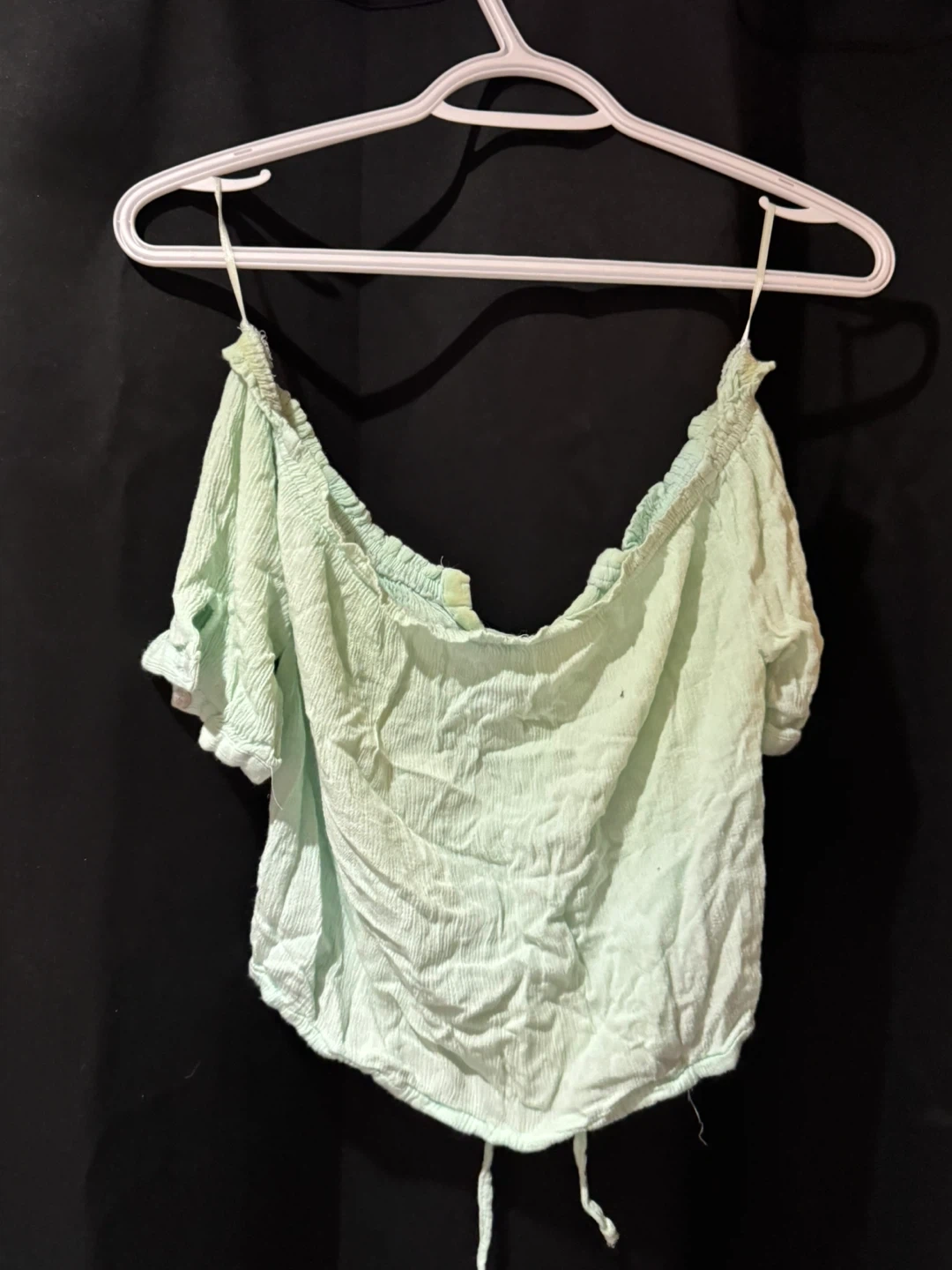 Light blue off-the-shoulder top with short ruffled sleeves and a button-up front. It's made from a crinkled fabric and has a drawstring tie at the hem. This top would be perfect for a summer day out!