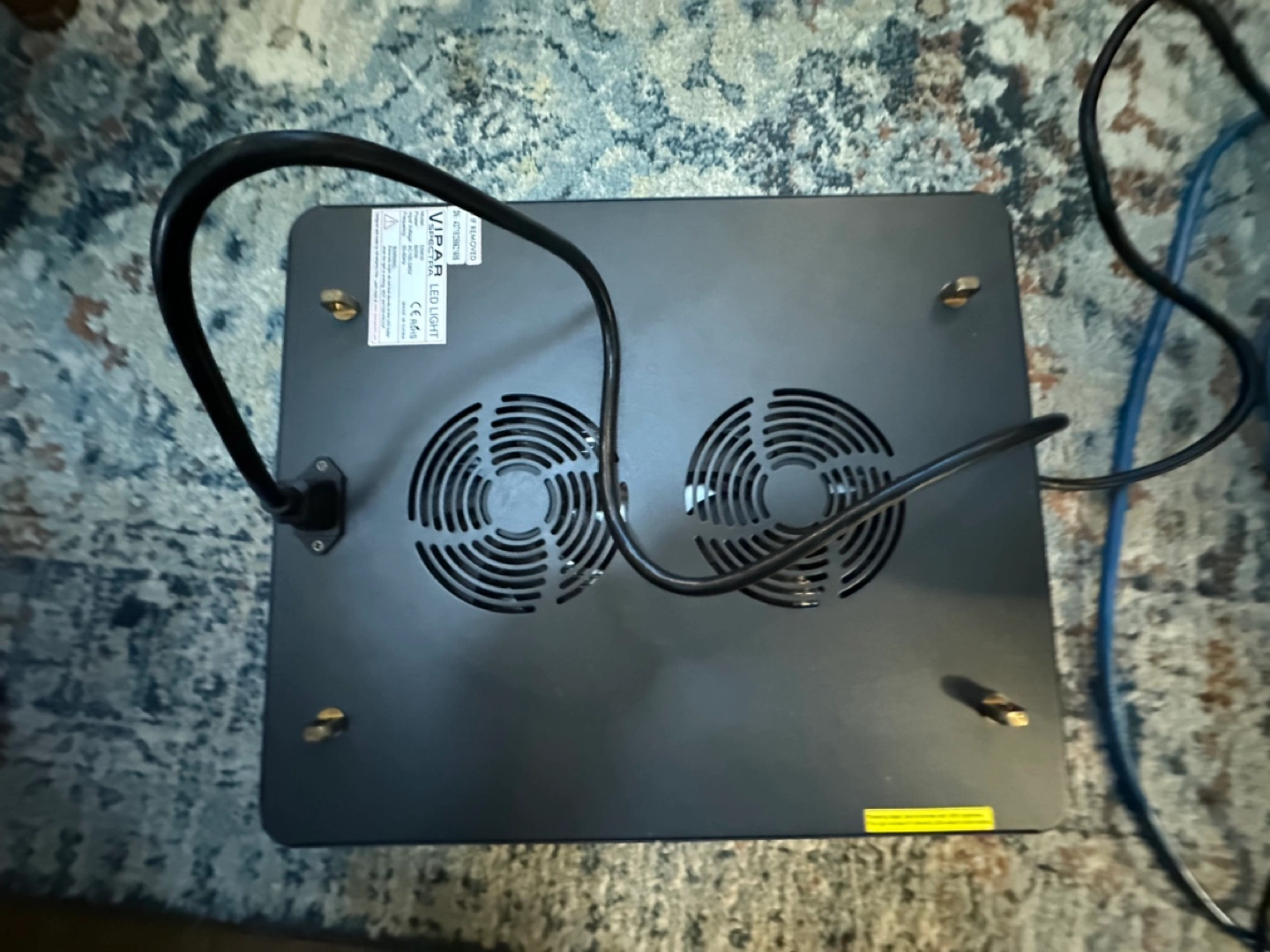 LED grow light with two fans. Includes power cord and hanging kit.