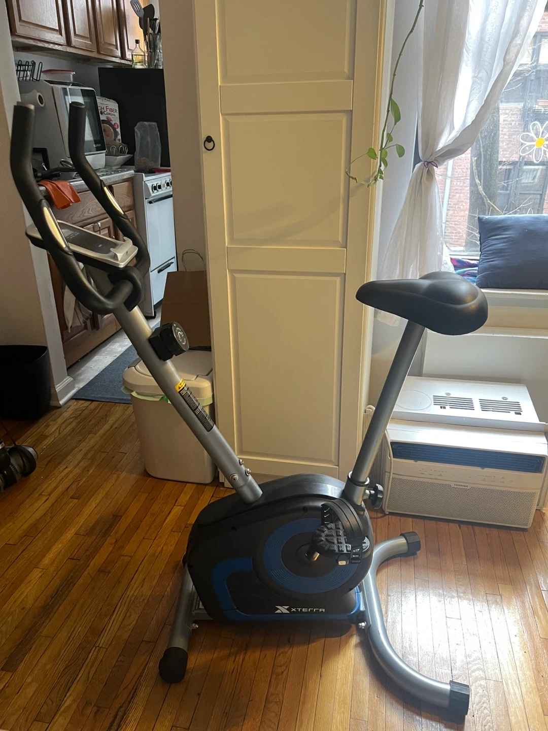 XTERRA stationary exercise bike. Features a digital display for tracking workouts. Adjustable seat and handlebars for customized comfort. Resistance knob allows for varied workout intensity. Will require 2 people to move.