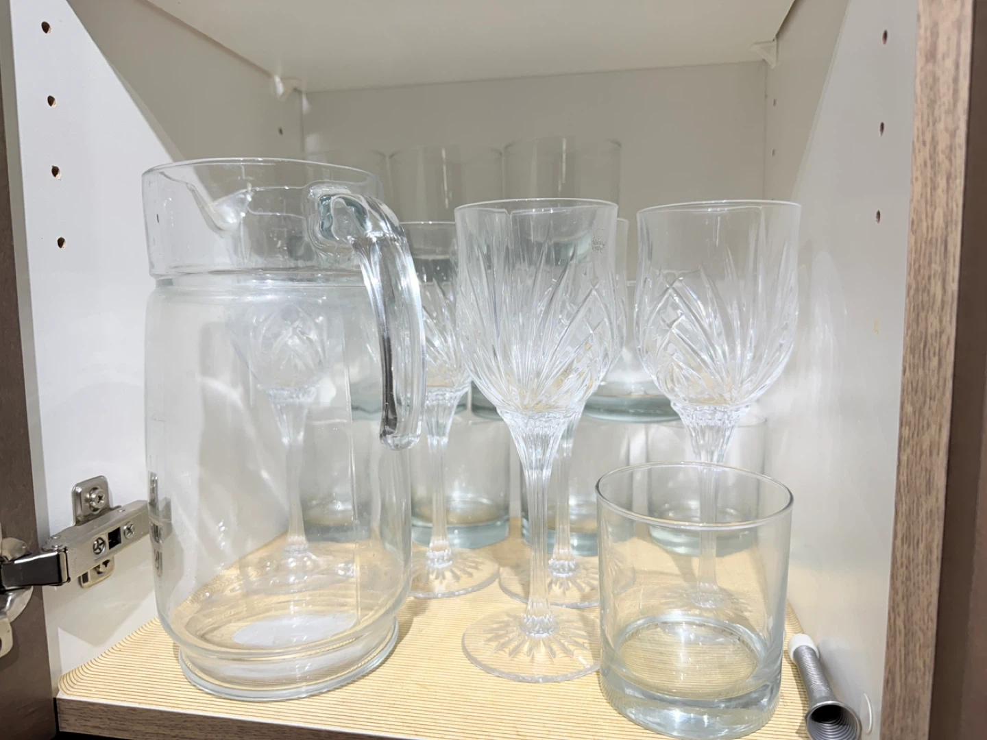 A glass pitcher with a handle, accompanied by several crystal-cut wine glasses and a tumbler. All pieces are clear glass. Great for serving beverages at gatherings! 5 wine glasses and 12 normal glasses
