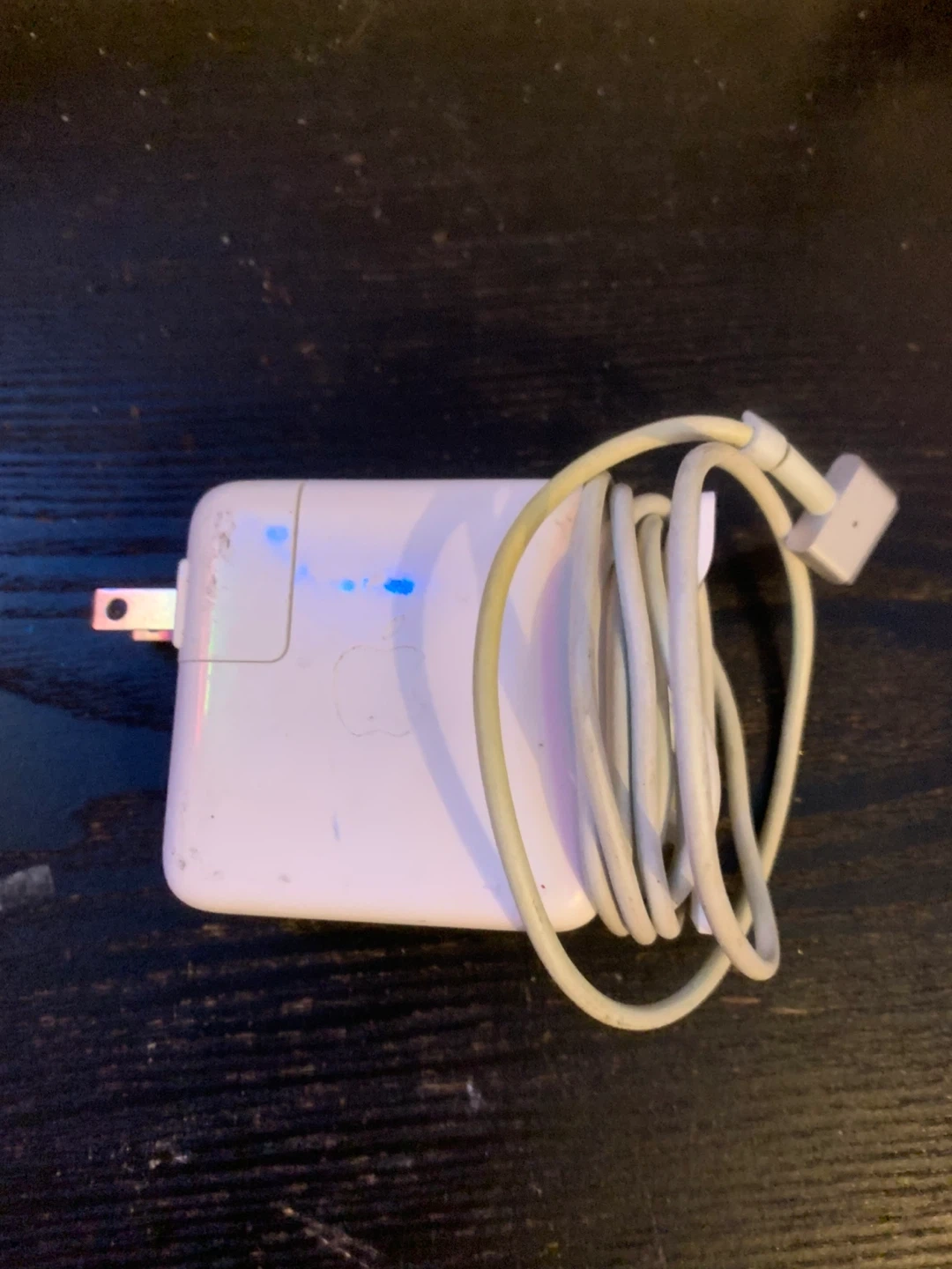 This is an Apple MagSafe 2 Power Adapter. It's a 45W model, designed by Apple in California. Works with MacBook Air models.