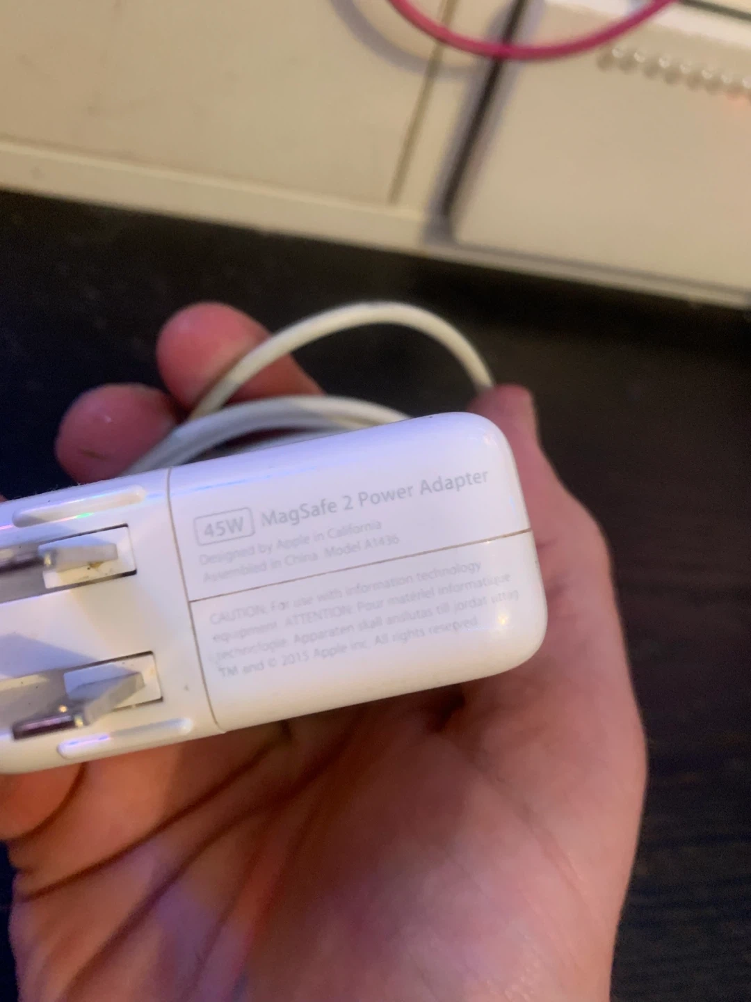 This is an Apple MagSafe 2 Power Adapter. It's a 45W model, designed by Apple in California. Works with MacBook Air models.