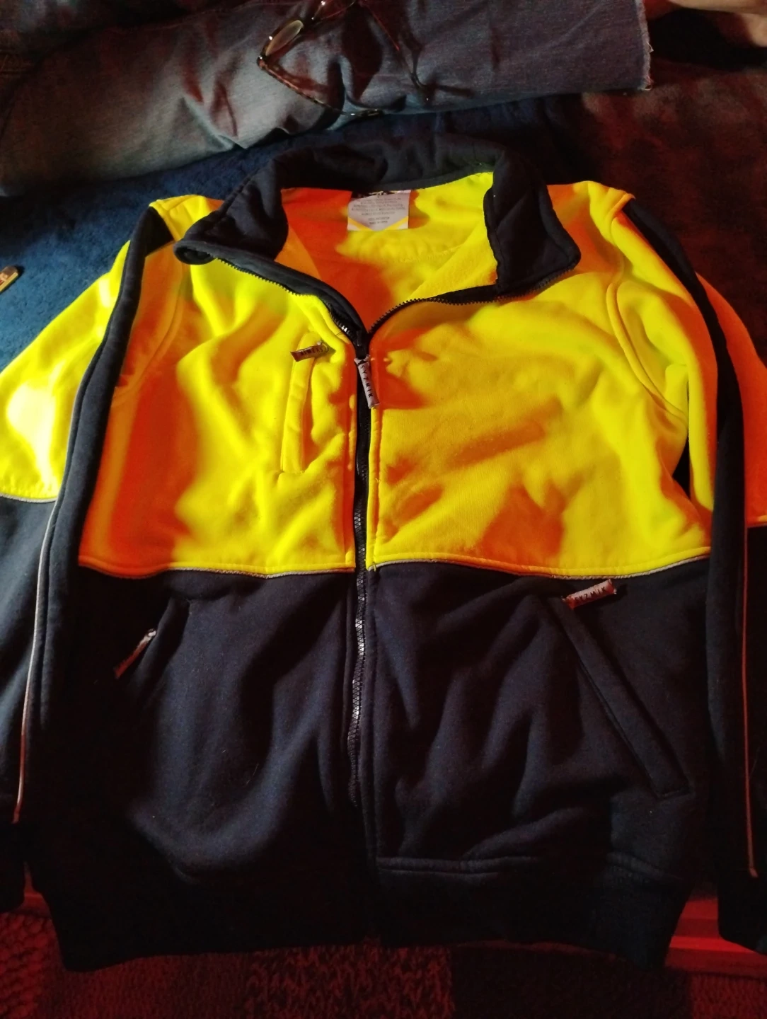 Selling a zip-up jacket with a vibrant yellow and black colour scheme. It features a full zipper and handy pockets. Perfect for layering or wearing on its own!