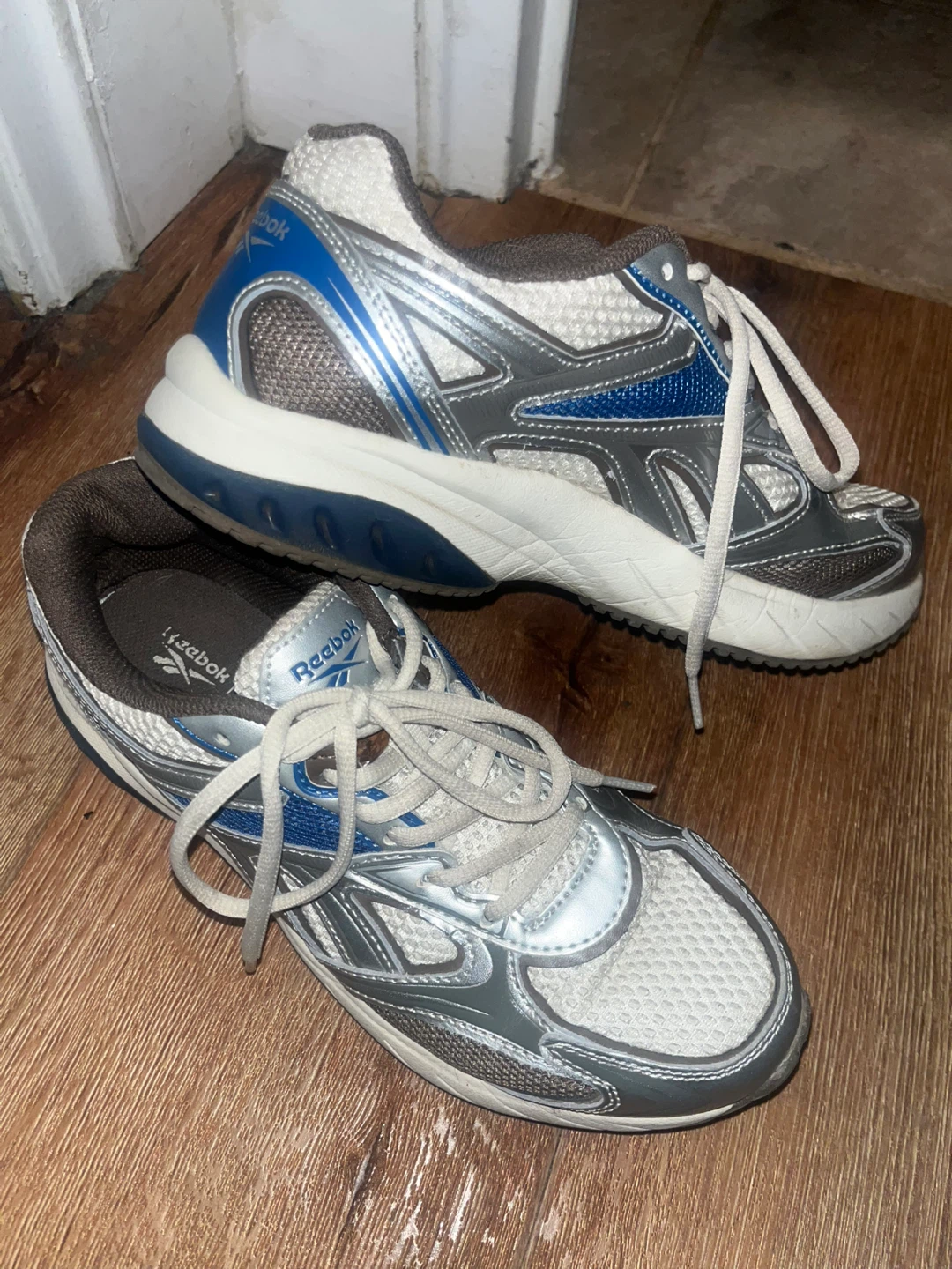 These Reebok running shoes are a size 10. They feature a silver, blue, and white design. Perfect for hitting the gym or going for a jog!