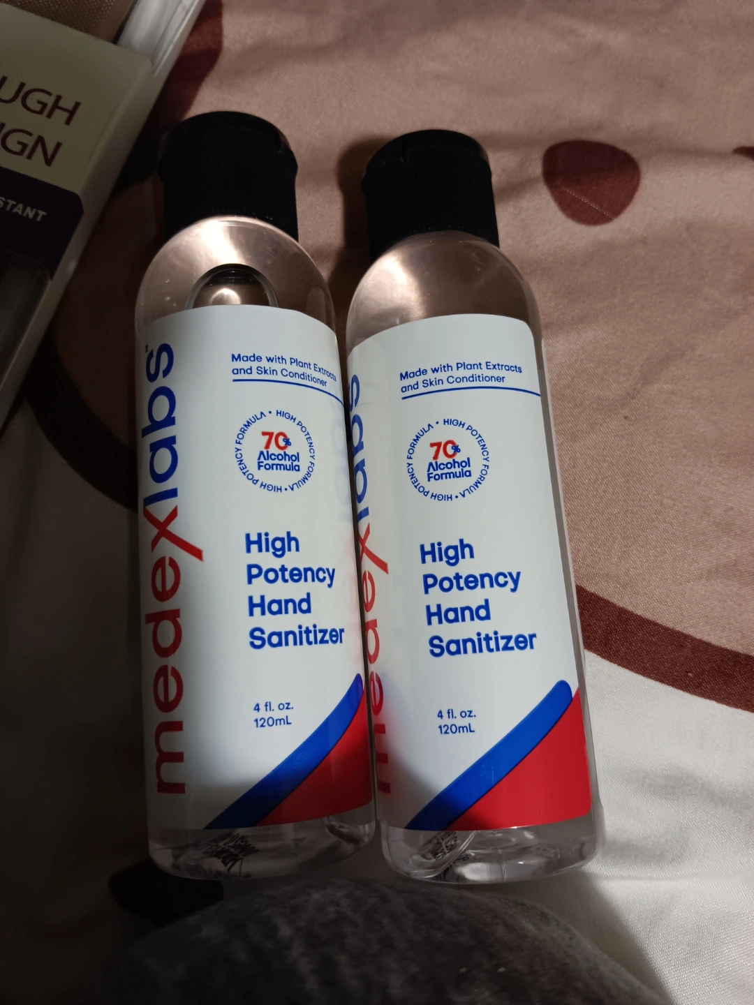 Two bottles of MedexLabs hand sanitizer. 70% alcohol formula. Made with plant extracts and skin conditioner. 4 fl. oz. each.