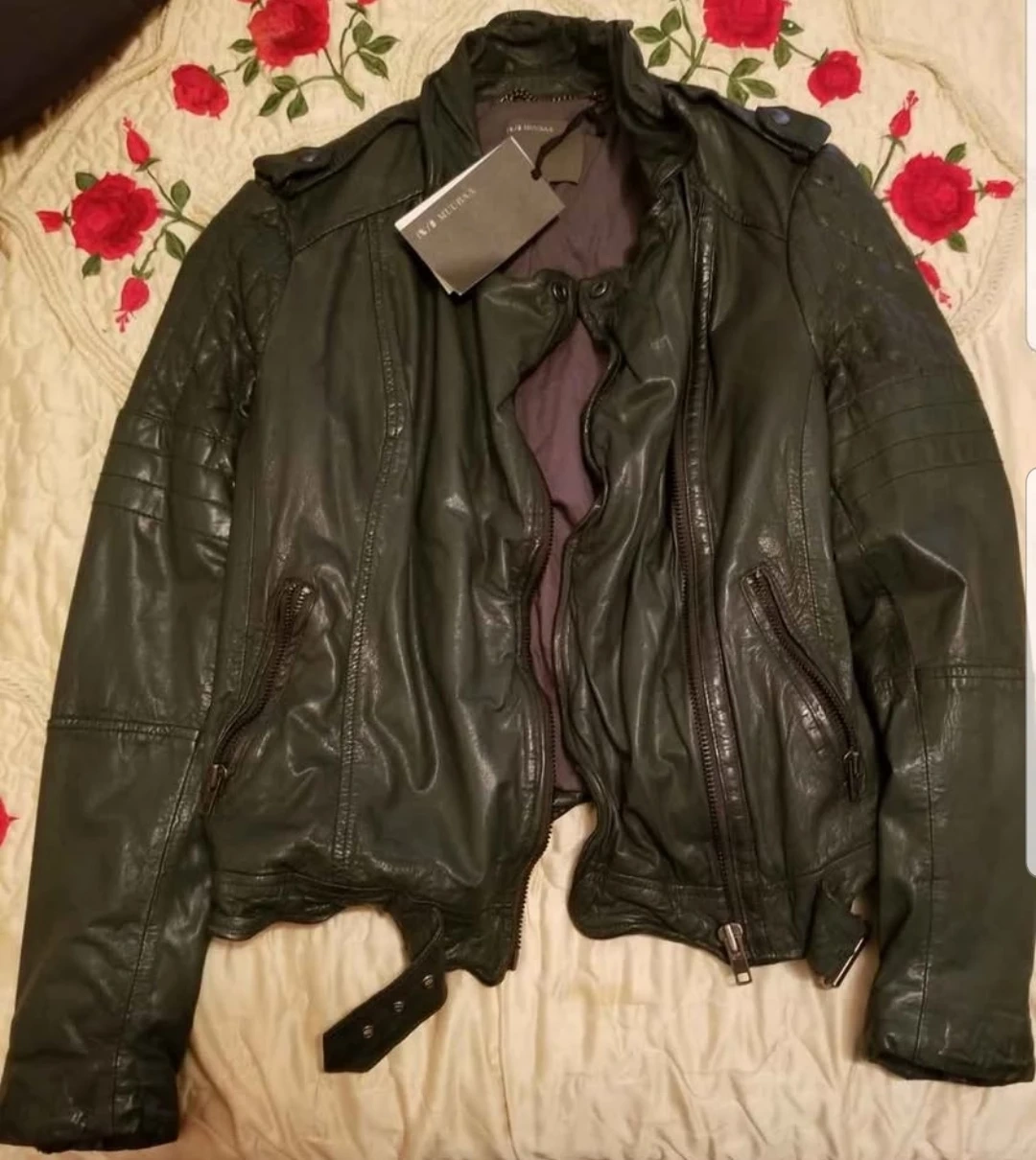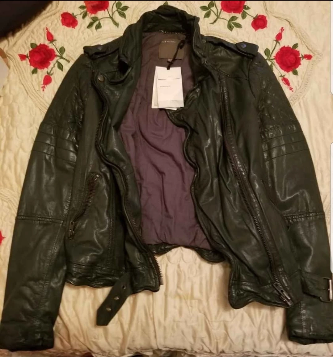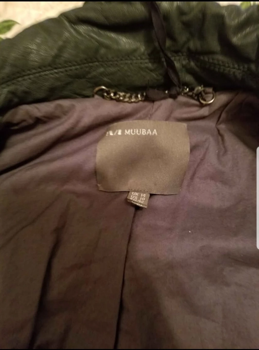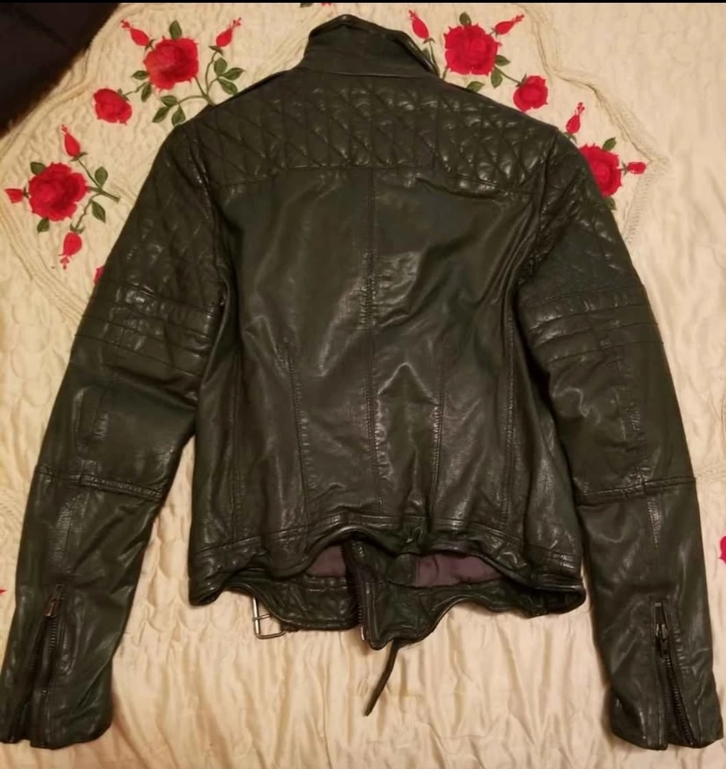 Gorgeous dark green leather jacket. Size 10 UK. Zipper closure. Multiple pockets. Belted waist. Quilted details. Excellent condition.
