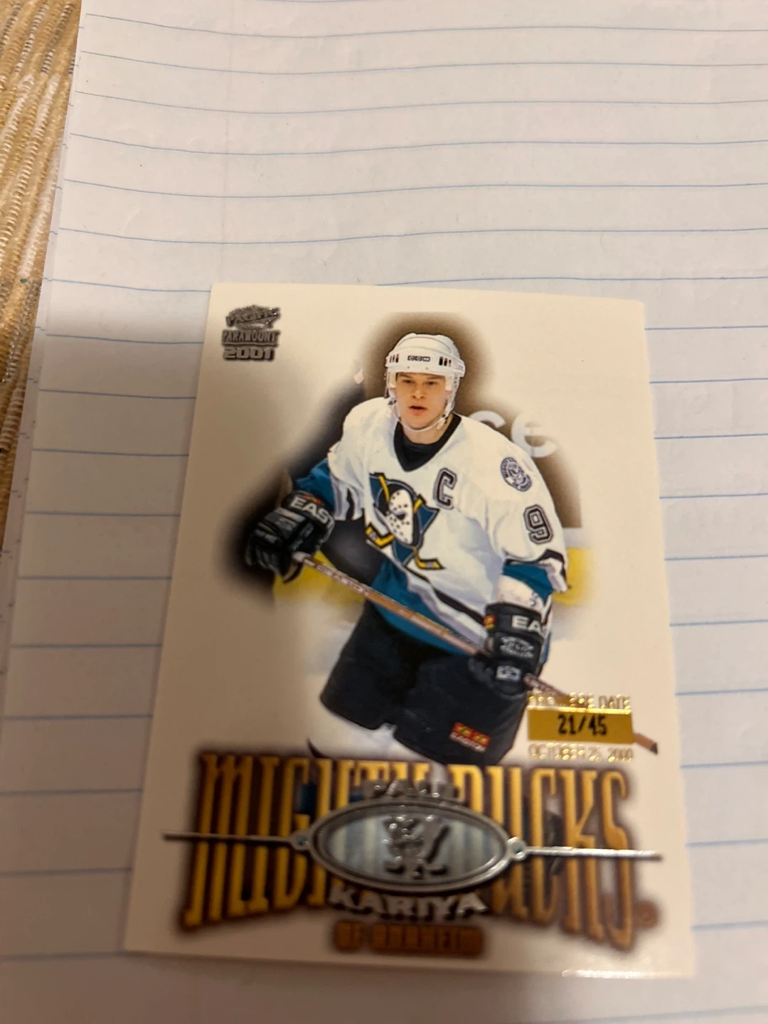 This is a 2001 Paramount hockey card featuring player Kariya. It's numbered 21/45 and dated October 25, 2000. This card is a great addition for any hockey collector!