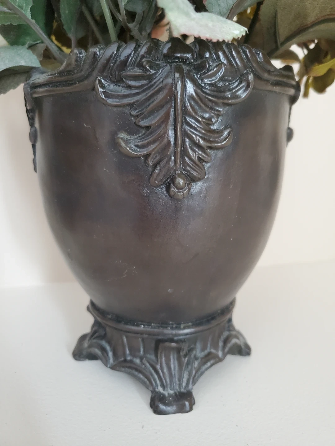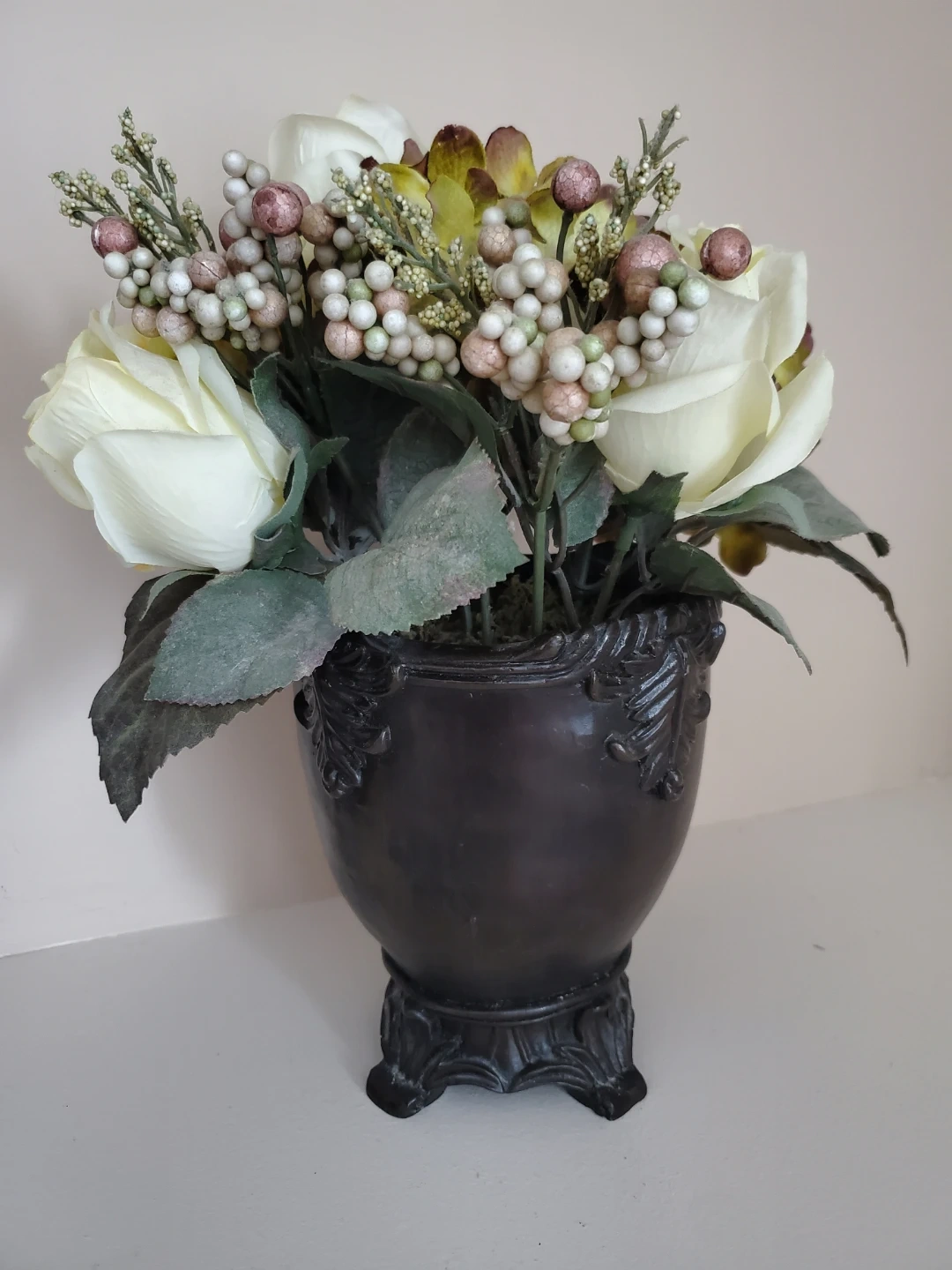 Decorative artificial flower arrangement featuring white roses, hydrangeas, and berries. It's housed in a dark, ornate vase with a footed base. See photos for dimensions.
