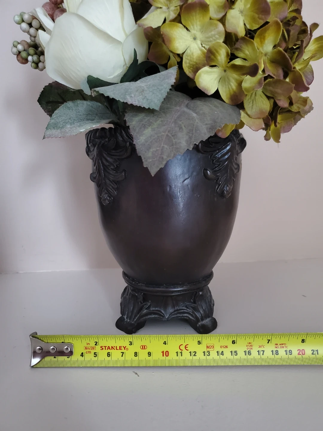Decorative artificial flower arrangement featuring white roses, hydrangeas, and berries. It's housed in a dark, ornate vase with a footed base. See photos for dimensions.
