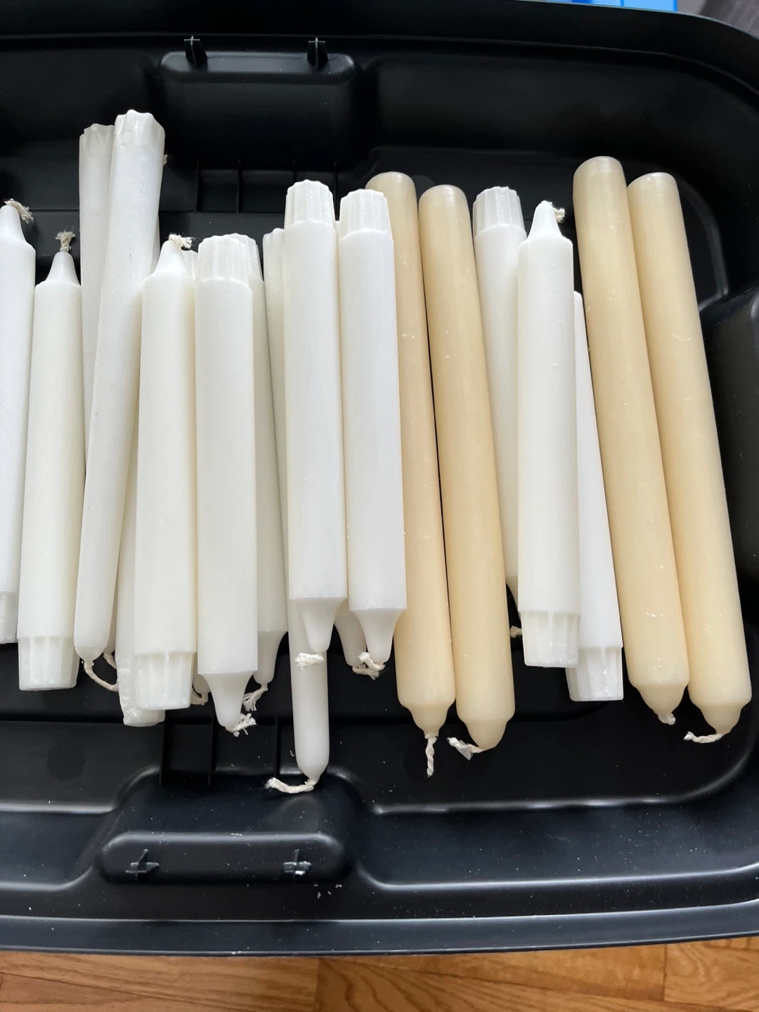 A bulk lot of taper candles in white and beige. There are approximately 25 candles of varying lengths. They're suitable for dinners or decorative use.