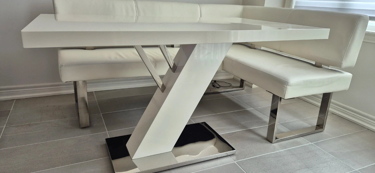 This 4-person breakfast nook dining set features a glossy white tabletop with a modern z-shaped pedestal base. The built-in bench seating is upholstered in white faux leather with chrome legs. It's a stylish and space-saving addition to any kitchen or dining area!