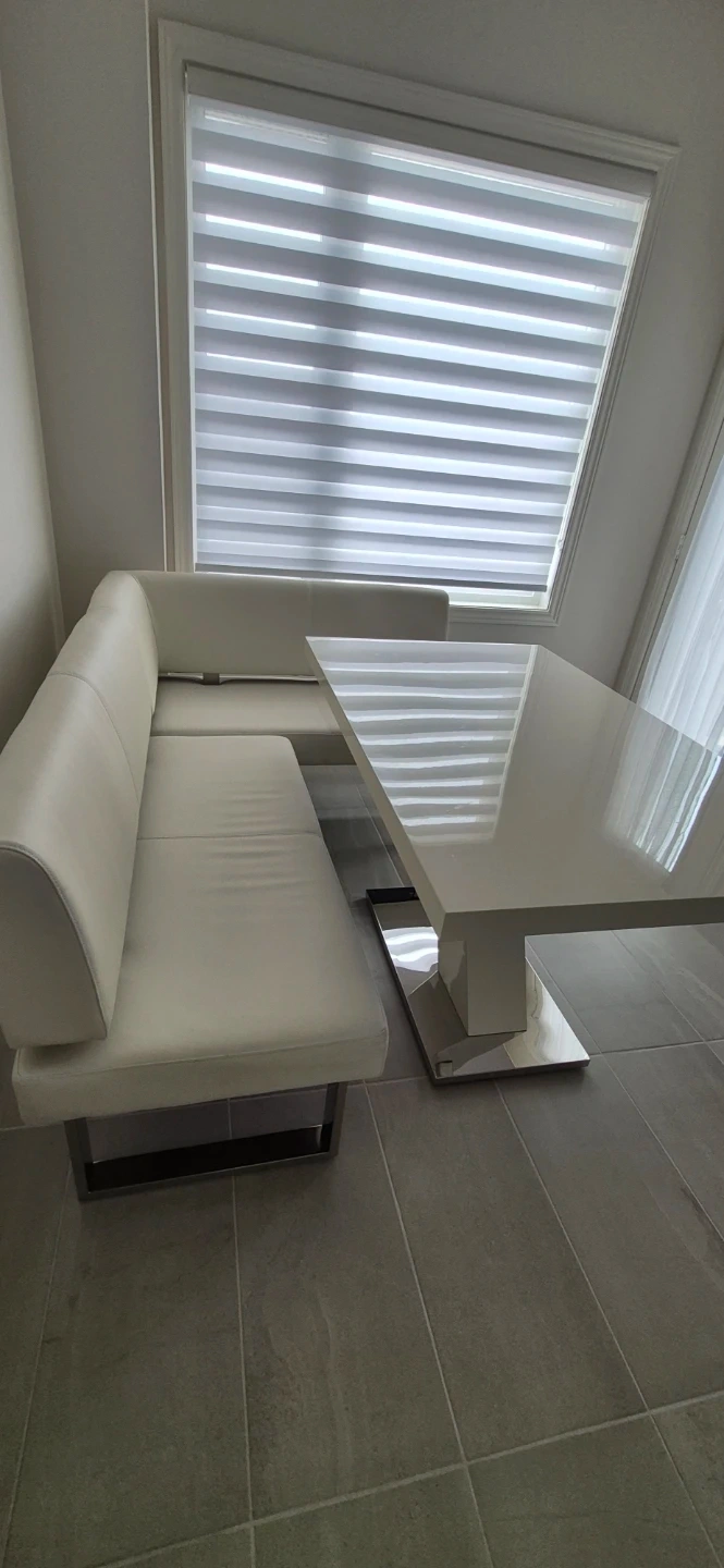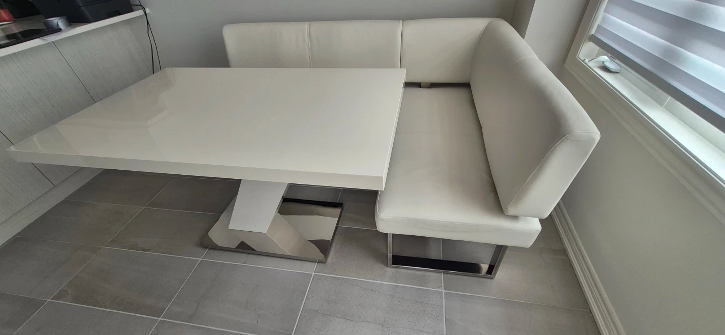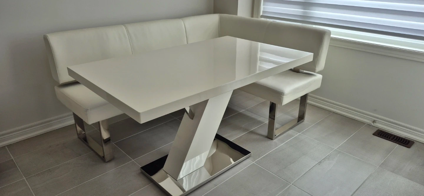 This 4-person breakfast nook dining set features a glossy white tabletop with a modern z-shaped pedestal base. The built-in bench seating is upholstered in white faux leather with chrome legs. It's a stylish and space-saving addition to any kitchen or dining area!