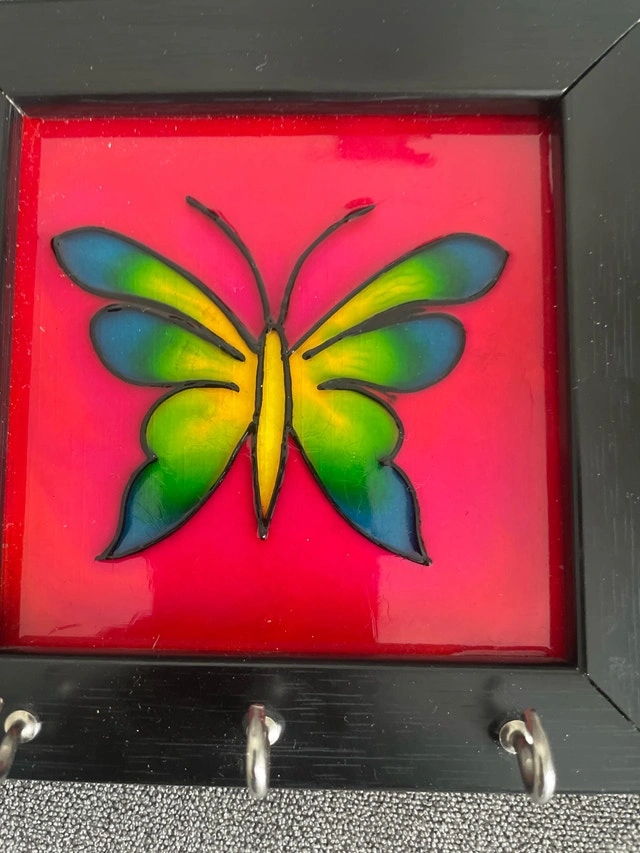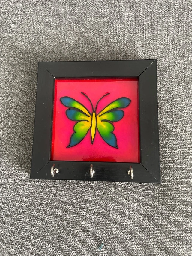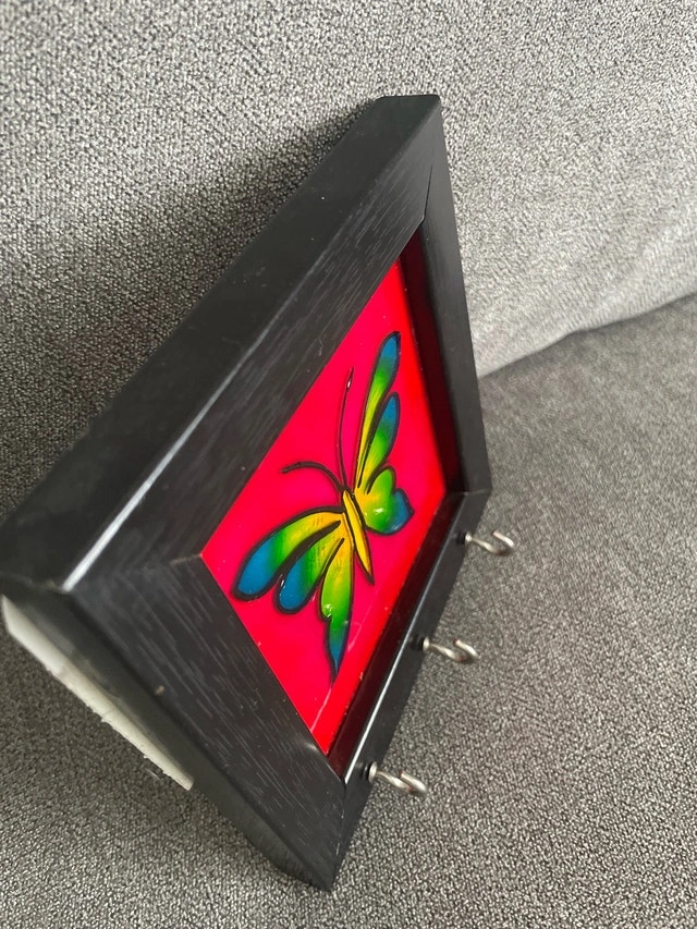 Add a touch of whimsy to your home with this charming, used butterfly key holder, perfect for keeping your keys organized with a touch of nature-inspired art. This key holder features a vibrant butterfly design set against a red background, framed in black, and equipped with three hooks for hanging keys. If the ad is still up, then yes, it's still available! Condition: Used - Good. For Sale By: Owner. Cash accepted: Yes.