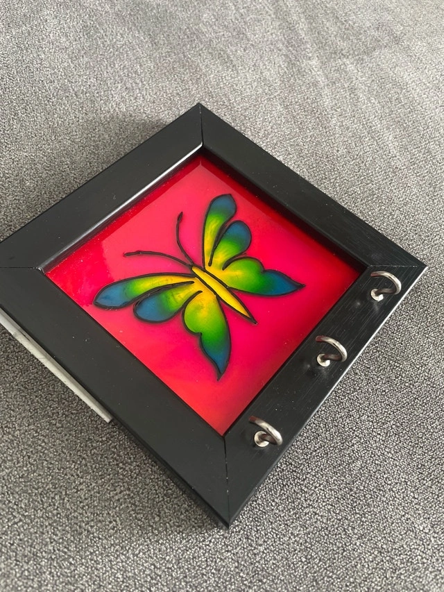 Add a touch of whimsy to your home with this charming, used butterfly key holder, perfect for keeping your keys organized with a touch of nature-inspired art. This key holder features a vibrant butterfly design set against a red background, framed in black, and equipped with three hooks for hanging keys. If the ad is still up, then yes, it's still available! Condition: Used - Good. For Sale By: Owner. Cash accepted: Yes.