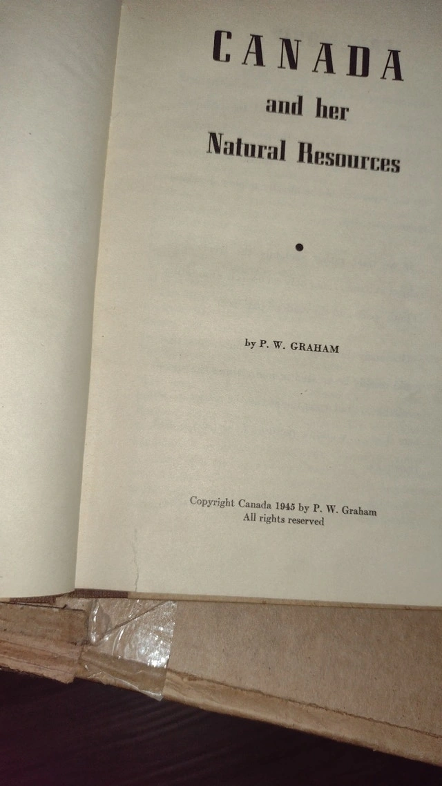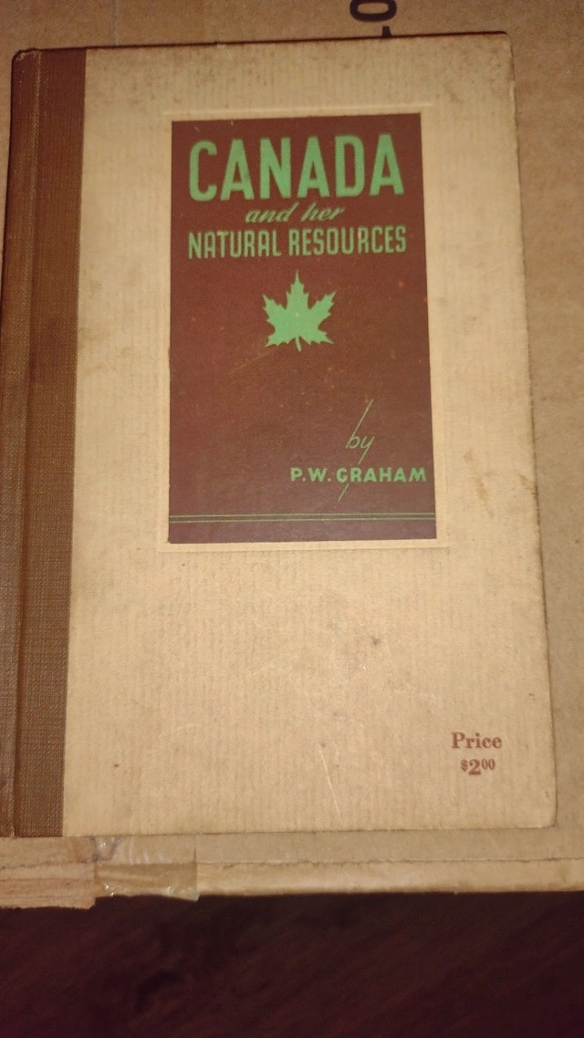 A vintage hardcover book titled Canada and Her Natural Resources by P.W. Graham. It is a detailed manual focused on Canada's resources, published around 1945. The book was a promotion for mining resources, given out by A.E. De Palma & Company.