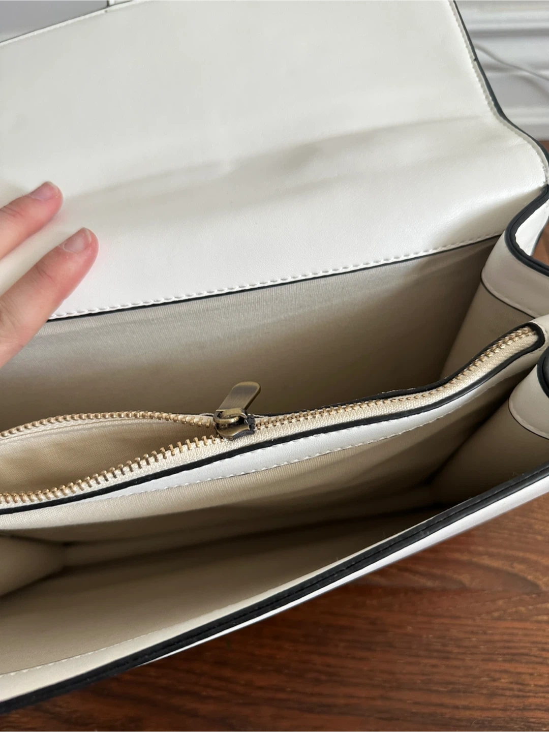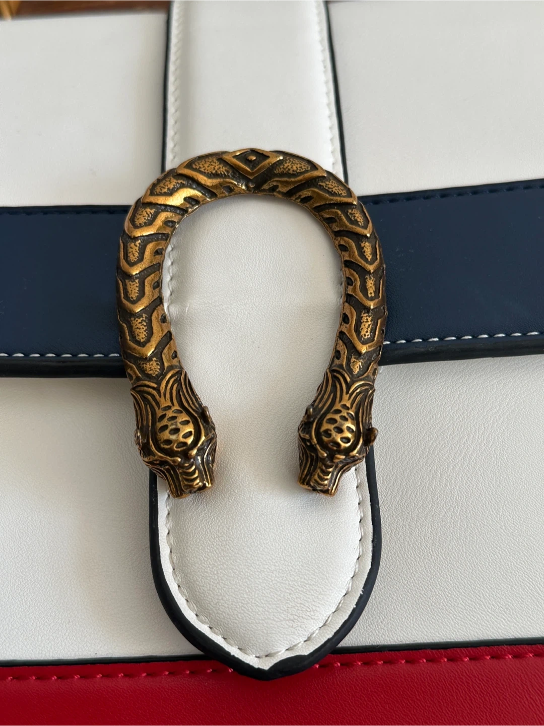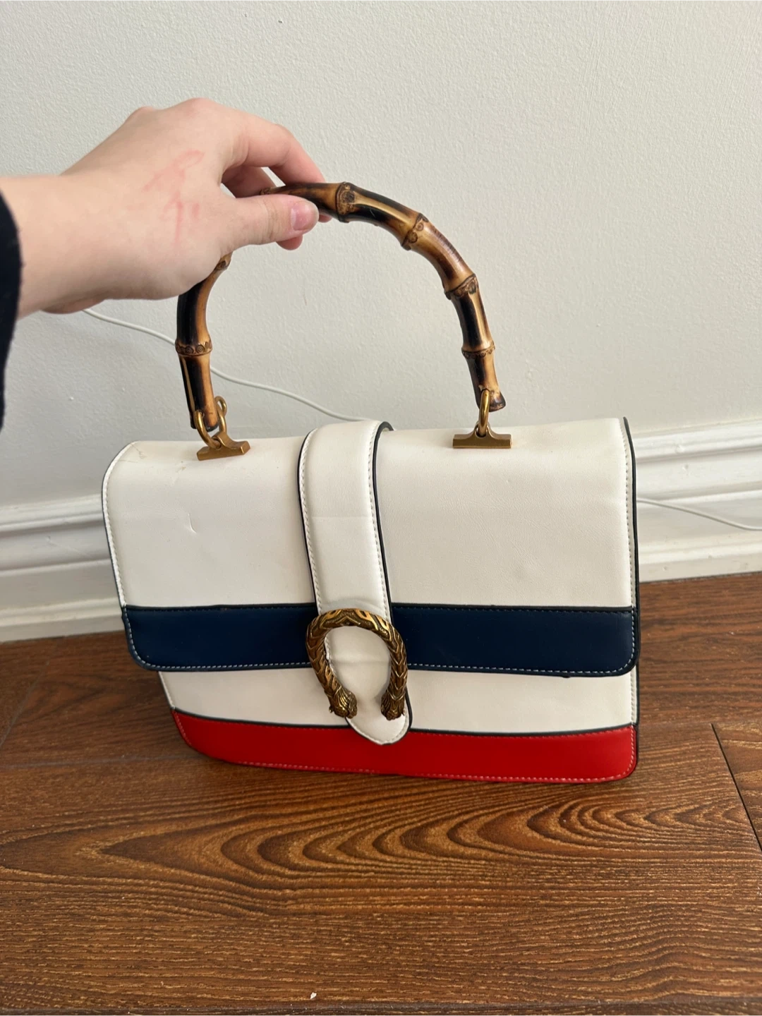 This stylish top-handle bag features a white exterior with bold colour blocking in navy and red. It has a decorative horseshoe-shaped closure with snake heads and a unique bamboo top handle. The interior includes a zippered pocket. It's a great accessory for adding a pop of colour to any outfit!