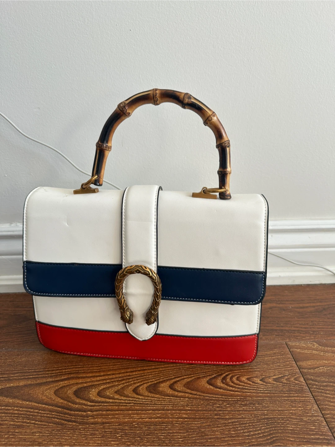 This stylish top-handle bag features a white exterior with bold colour blocking in navy and red. It has a decorative horseshoe-shaped closure with snake heads and a unique bamboo top handle. The interior includes a zippered pocket. It's a great accessory for adding a pop of colour to any outfit!