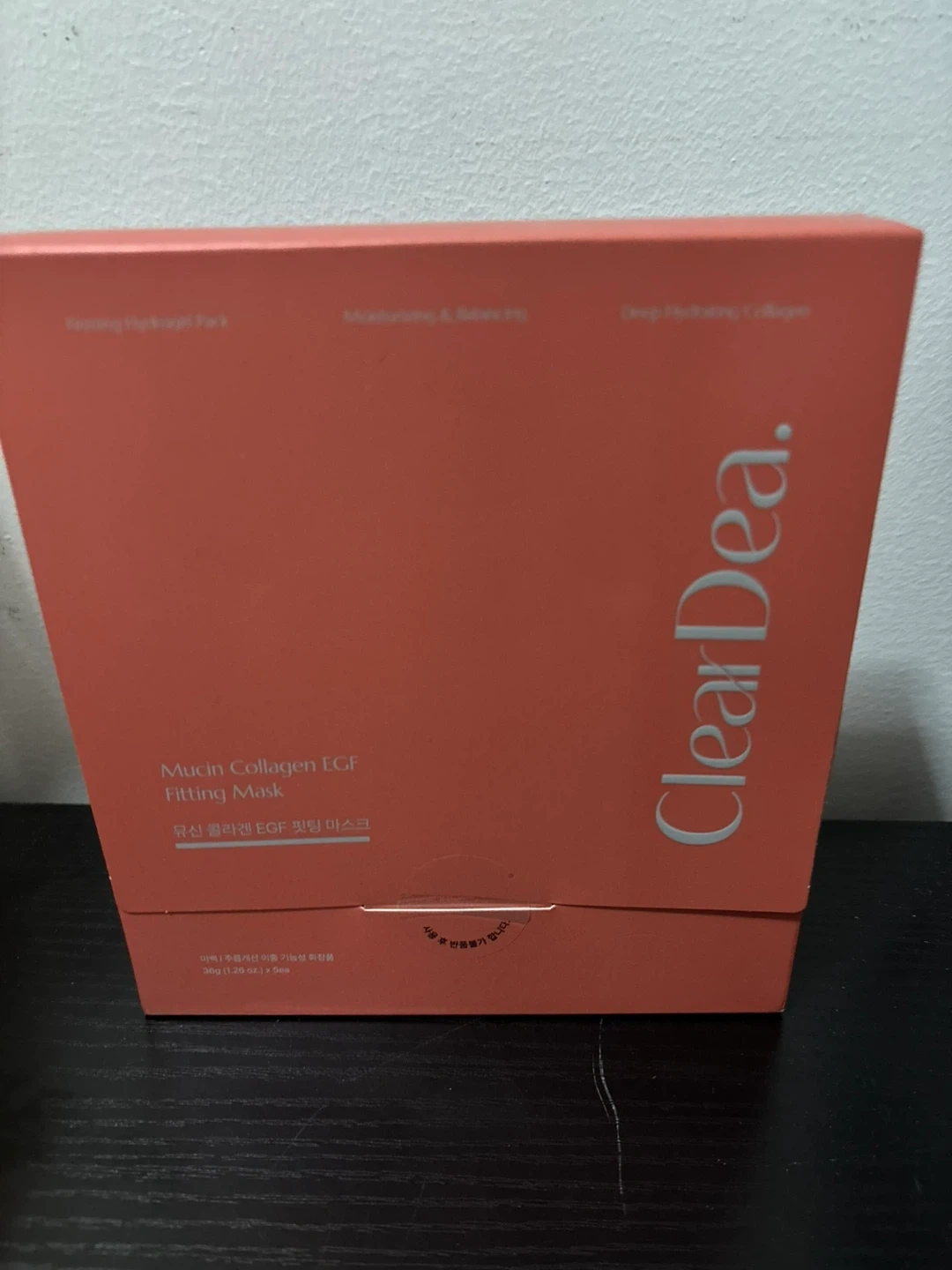 This is a box of ClearDea. Mucin Collagen EGF Fitting Masks. Each mask is 36g (1.26 oz). They're designed for whitening and wrinkle improvement.